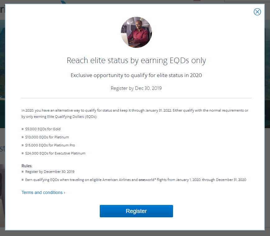 To earn American Airlines elite status, flyers generally need to hit a spending threshold (EQD) and either a mileage (EQM) or segment (EQS) threshold. But, in 2020, targeted American Airlines flyers will be able to earn elite status solely by earning enough Elite Qualifying Dollars (EQD).