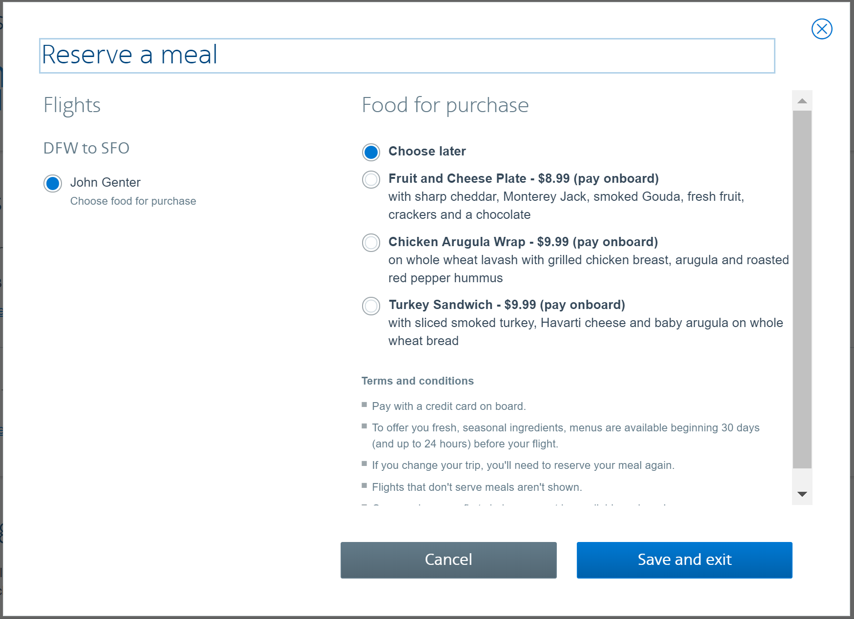 Your pre-order options are going to be limited to the standard light meal options that would otherwise be available on the flight. Since I don't have any qualifying flights in the next 30 days, I held an award ticket from Dallas/Fort Worth (DFW) to San Francisco (SFO) within this period to check the offerings:
