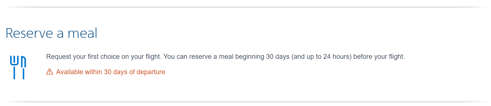 You can place your pre-order between 30 days and 24 hours before your flight by logging into your reservation on the American Airlines website or app. If your flight is outside of this window, you'll get the following error: