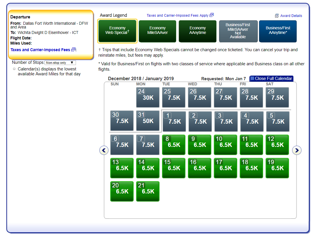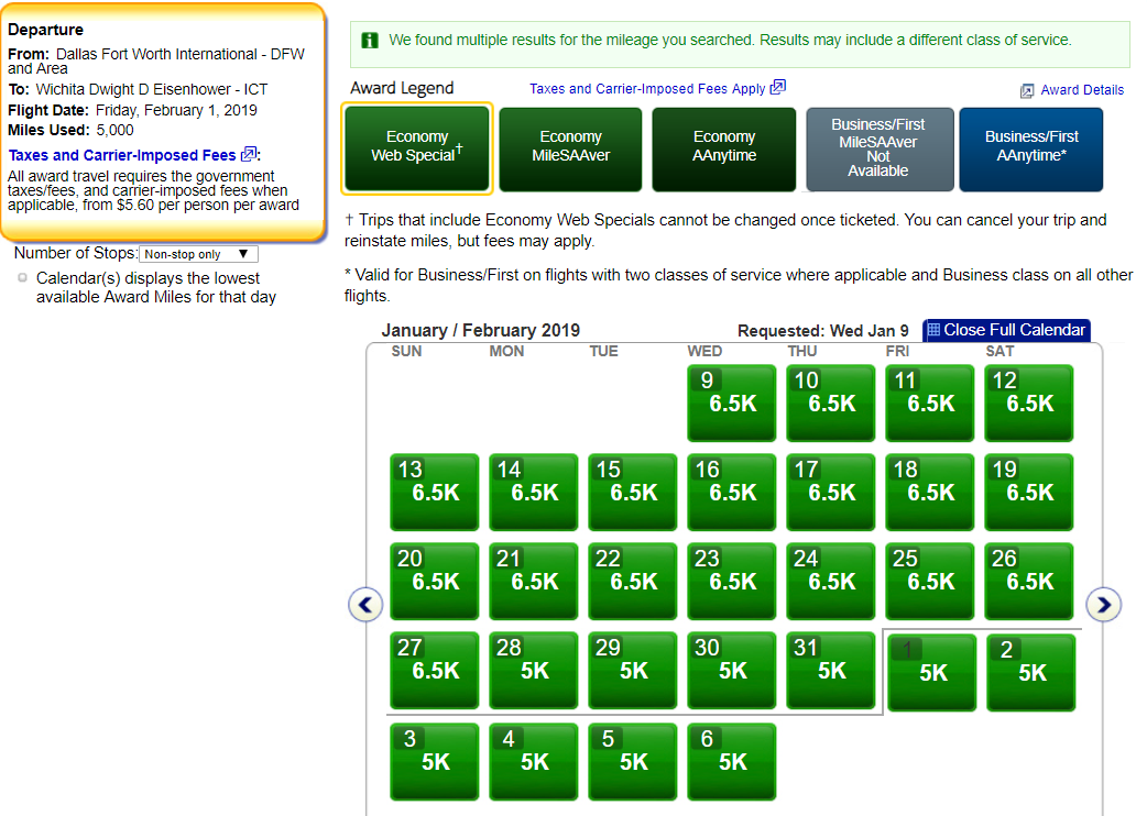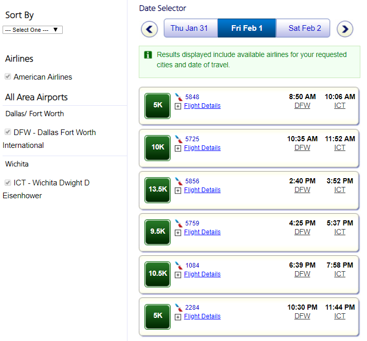 However, not all flights are discounted to the same price. For example, on February 1 from Dallas to Wichita, "discounted" awards range from 5,000 miles all the way up to 13,500 miles for the one-way award flight: