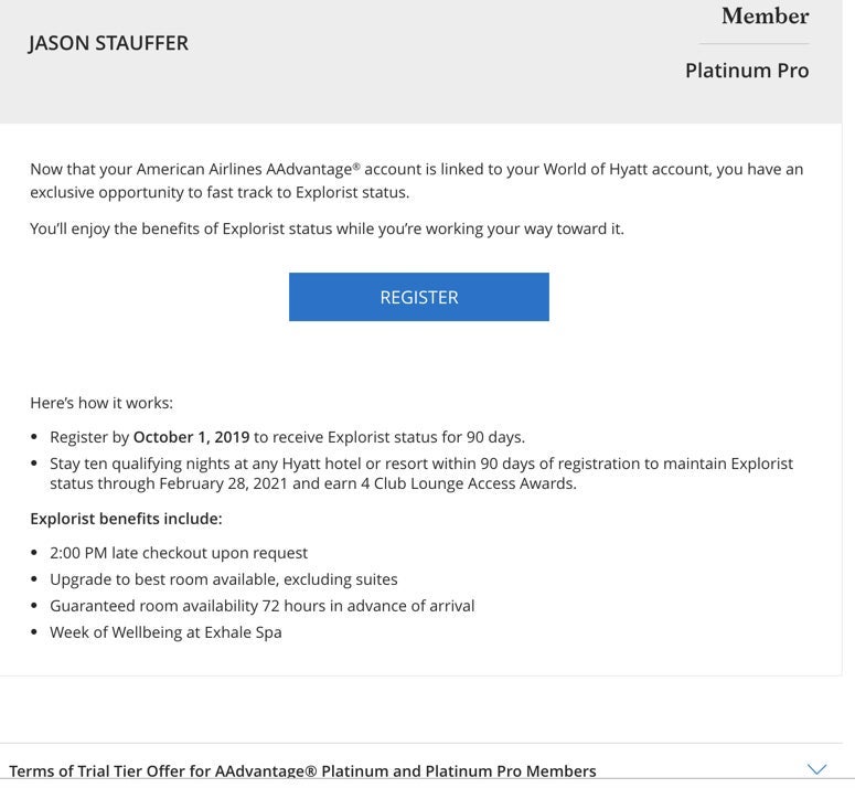 As a World of Hyatt Globalist and AAdvantage Gold, I wasn't targeted for an offer myself, but an AA Platinum Pro colleague did receive an offer for trial Hyatt Explorist status, with an opportunity to retain status (and earn four Club Lounge Access Awards) after staying 10 qualifying nights within 90 days of registration — a much more achievable requirement than the usual 30 qualifying nights.
