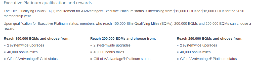 While making it harder to reach Executive Platinum status, American Airlines is also increasing the benefits for its most frequent flyers. Starting in 2019, members who qualify for AAdvantage Executive Platinum status will be able to start choosing additional rewards when they reach 150k, 200k and 250k EQM thresholds.