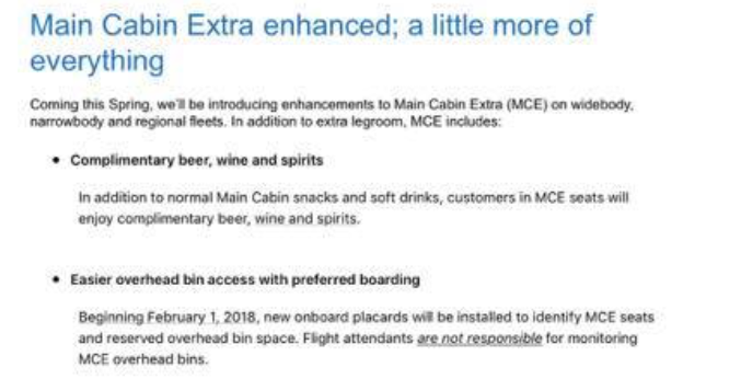As expected, Main Cabin Extra seats will soon receive "complimentary beer, wine and spirits." There isn't a rollout date yet for this new benefit — only the reference to "coming this spring." The airline will announce this benefit when it knows the introduction date.