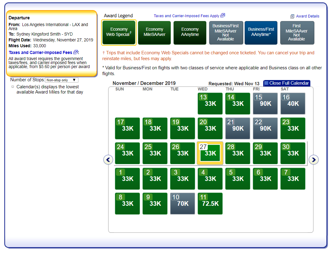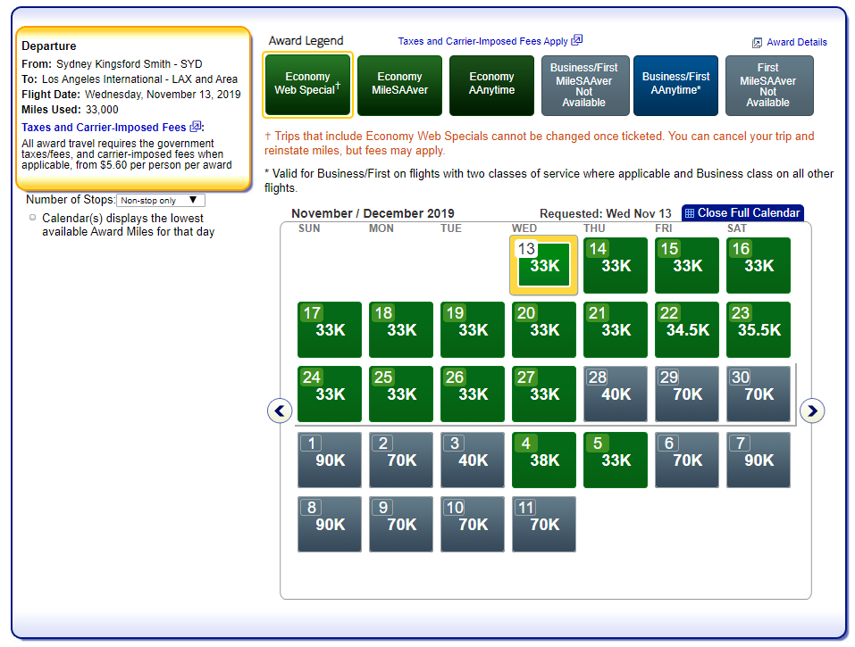 The same 33,000-mile pricing was showing up on the route from Sydney to Los Angeles: