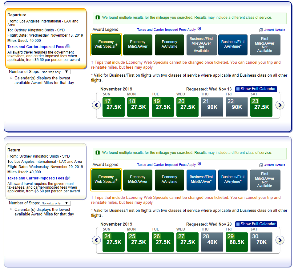 And here are the results when searching the same dates the same route but as part of a round-trip award: