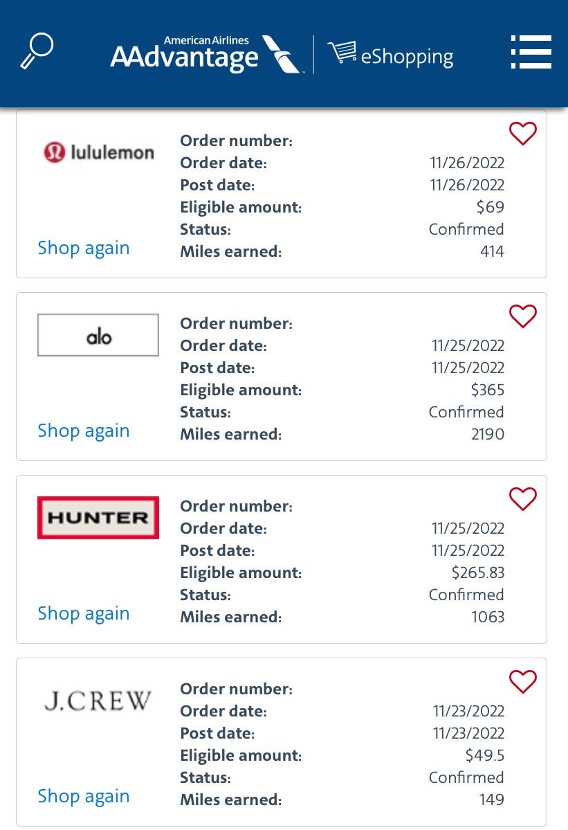 As of December 2022, miles earned from online shopping with AAdvantage eShopping count toward Loyalty Points at a 1:1 ratio. The number of miles you earn depends on the specific retailer and price point. For example, I earned almost 4,000 Loyalty Points through purchases made at Hunter Boots, Alo Yoga, Lululemon and Gap, based on their earnings offerings and transaction totals.