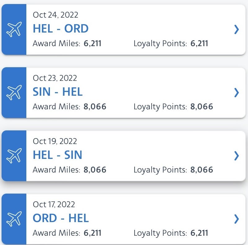 To do this, I took a rather indirect flight route from ORD to Singapore Changi Airport (SIN). The route was a round-trip flight on Finnair in October across four segments: ORD-Helsinki Airport (HEL), HEL-SIN, SIN-HEL and HEL-ORD. In total, I flew more than 20,00 miles over five days to earn 28,554 American Loyalty Points through Finnair, a Oneworld member.
