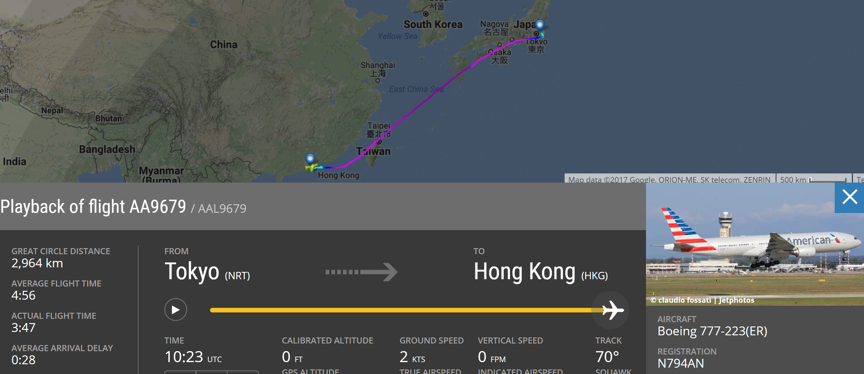 In a retrofit originally scheduled to be complete by the end of June, American Airlines just sent the last of its 777-200s with angle-flat 2-3-2 business class seating to the shop in Hong Kong (HKG) to be revamped. The twin-engine jet with registration #N794AN arrived at Tokyo's Narita (NRT) airport after its final flight with sub-par business-class seating on Saturday, July 22 before being ferried to HKG on Sunday (July 23).