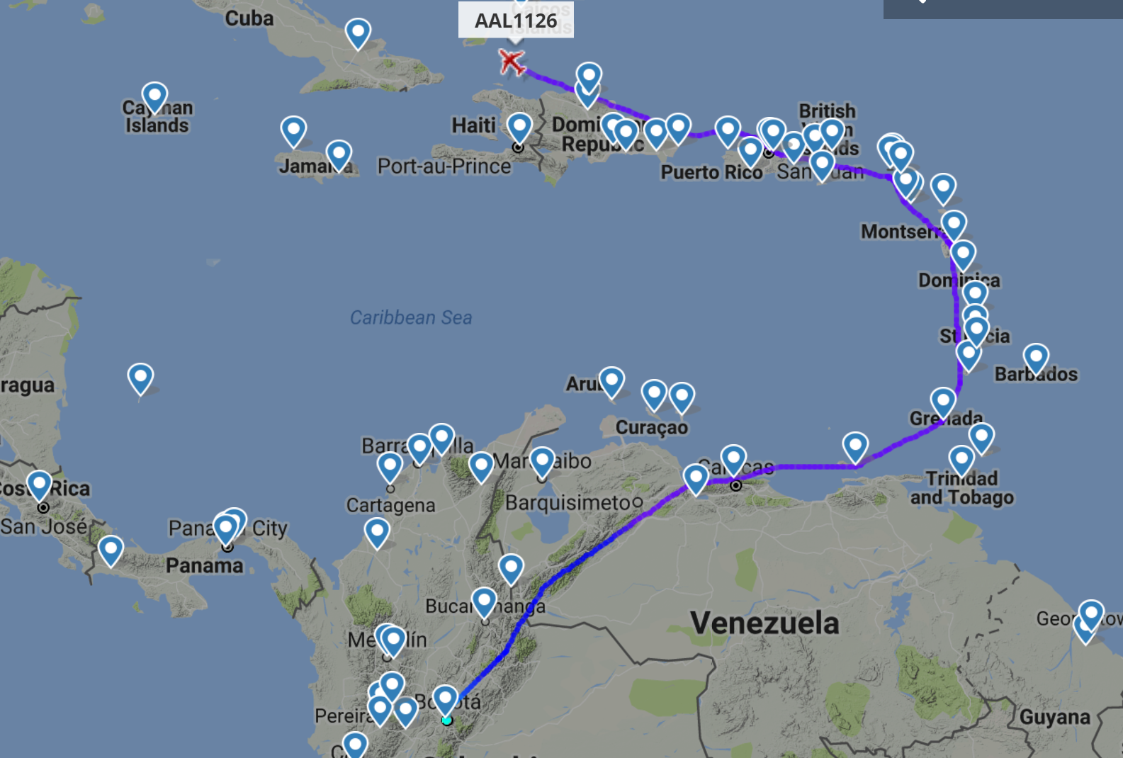 Not surprisingly, there's a very precise reason for this long routing. The aircraft was grounded for technical issues in Bogota. Although the mechanics gave the aircraft clearance to return to Miami (MIA), American Airlines planned the route so the aircraft didn't veer far from diversion airports. This becomes clear when you overlay the Caribbean airports on the route map: