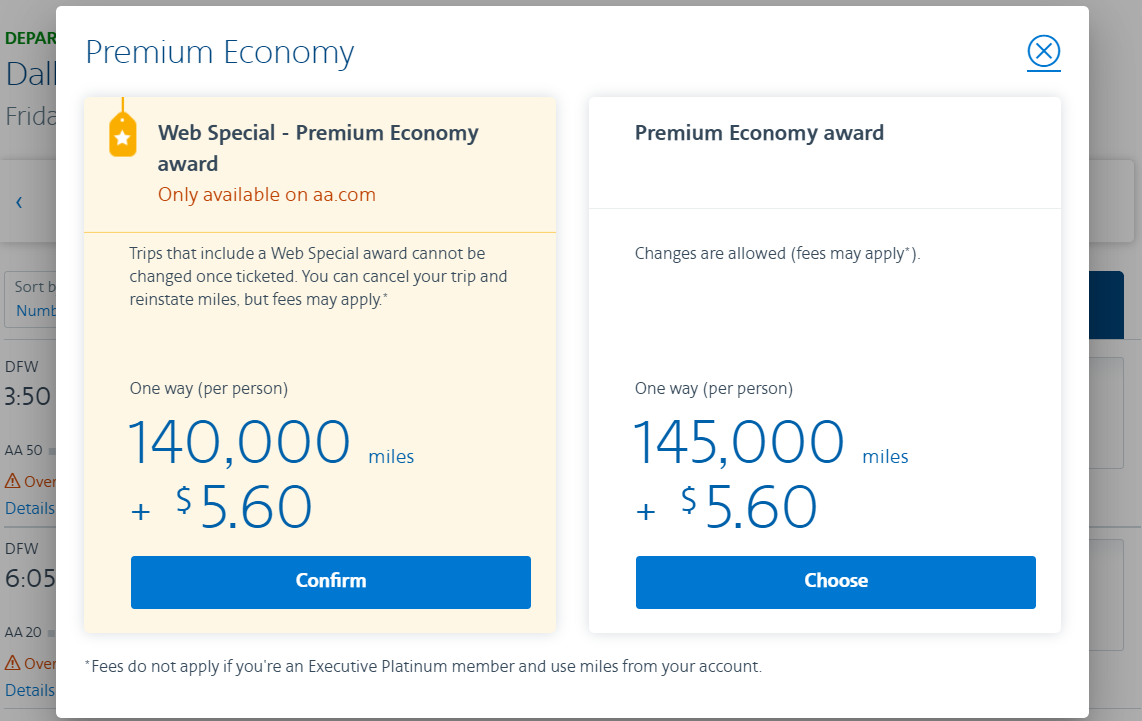 American just added premium economy awards to its award chart in January 2019. For flights between the U.S. and Europe, the highest published award pricing is 110,000 miles each way. However, we are finding "web special" pricing at 140,000 miles each way: