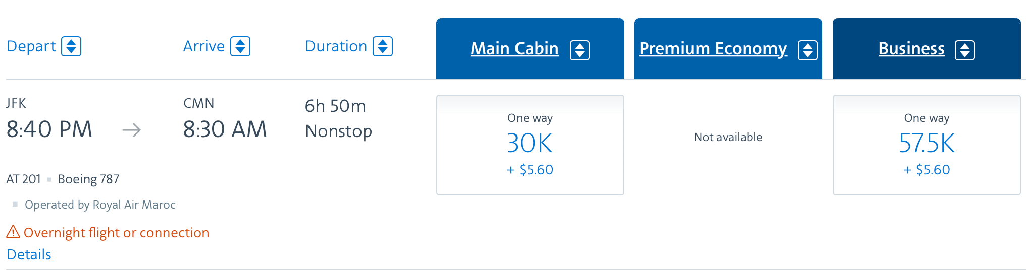 Pricing Royal Air Maroc award tickets