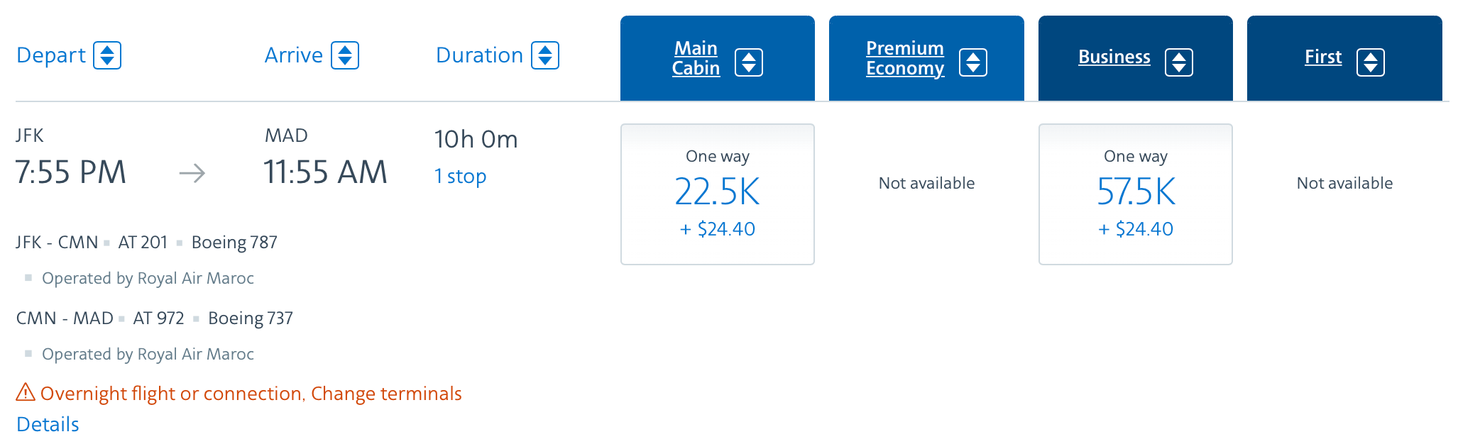 Until now, there hasn't been a way to find Royal Air Maroc award space online, so you had to call Etihad and have the phone representative find award space for you. Now with award space showing online, you can find Royal Air Maroc award space on AA.com before you call and speed up the booking process.