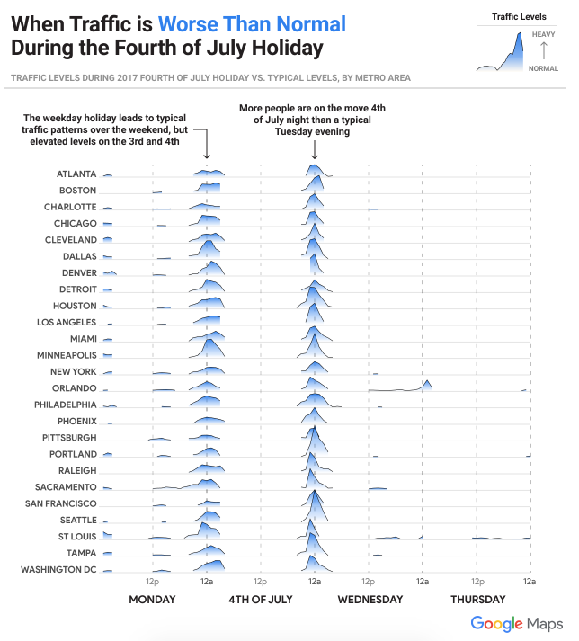 To help drivers plan ahead and avoid the inevitable holiday traffic jams, Google Maps created an interactive guide to navigating 2018 Independence Day traffic, which offers travelers a ballpark picture of the best and worst times to leave home. The site includes national trends as well as city-specific data for 25 cities across the US.