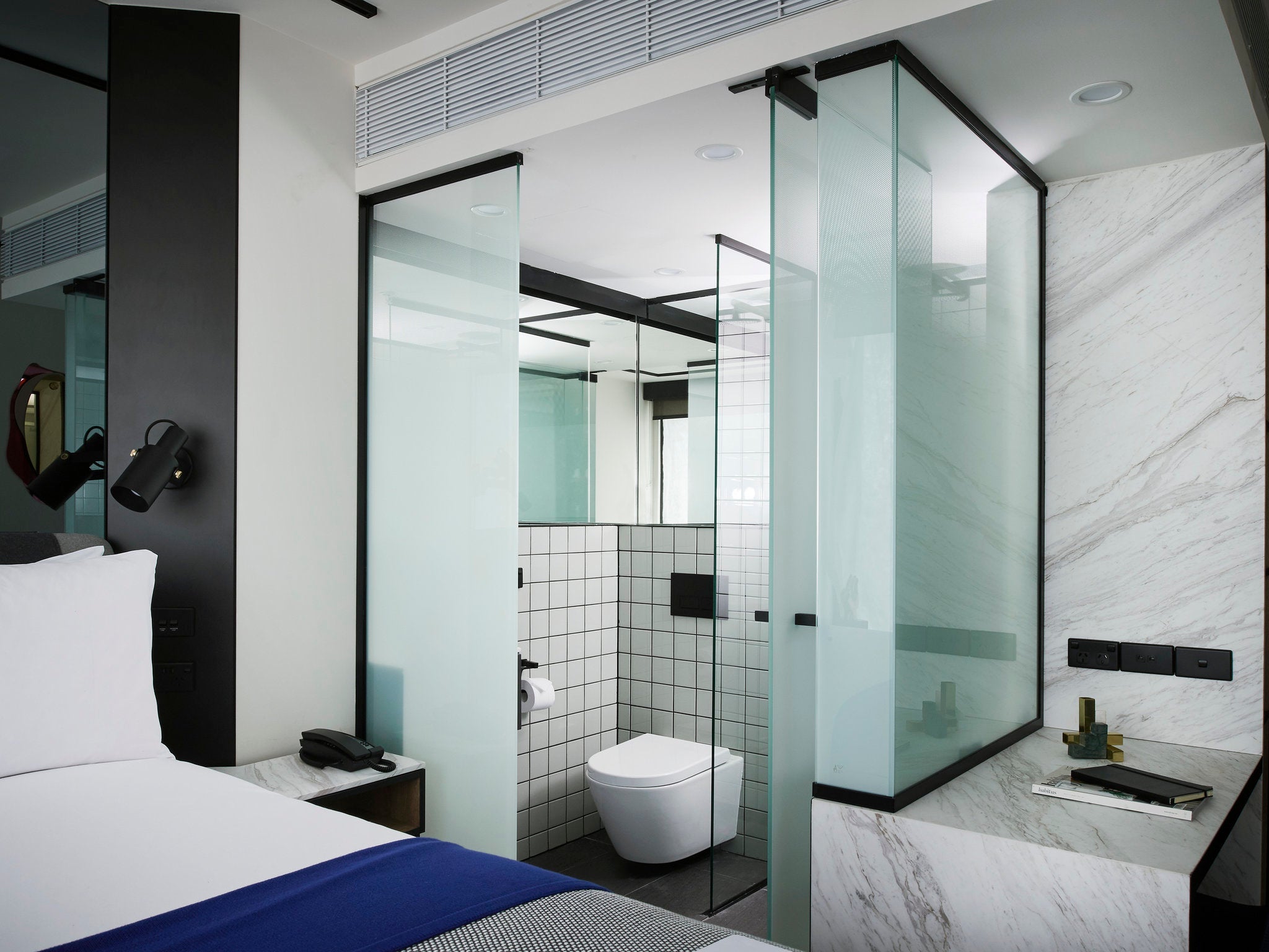 There's no minibar, concierge, bellhop or pool. But, there is free Wi-FI, bikes and plenty of communal spots to hang. In fact, it's pretty clear that lounging in your room — although comfortable — is not the primary reason to stay at Tribe. The rooms feature all of the essentials for a relaxing overnight, including high-end bath products from Kevin Murphy and floor-to-ceiling windows. But they're, well, cozy. Read: not family-friendly. Instead, the brand is explicitly catering to "independent" travelers. We take that to mean young solo travelers, business travelers and couples.