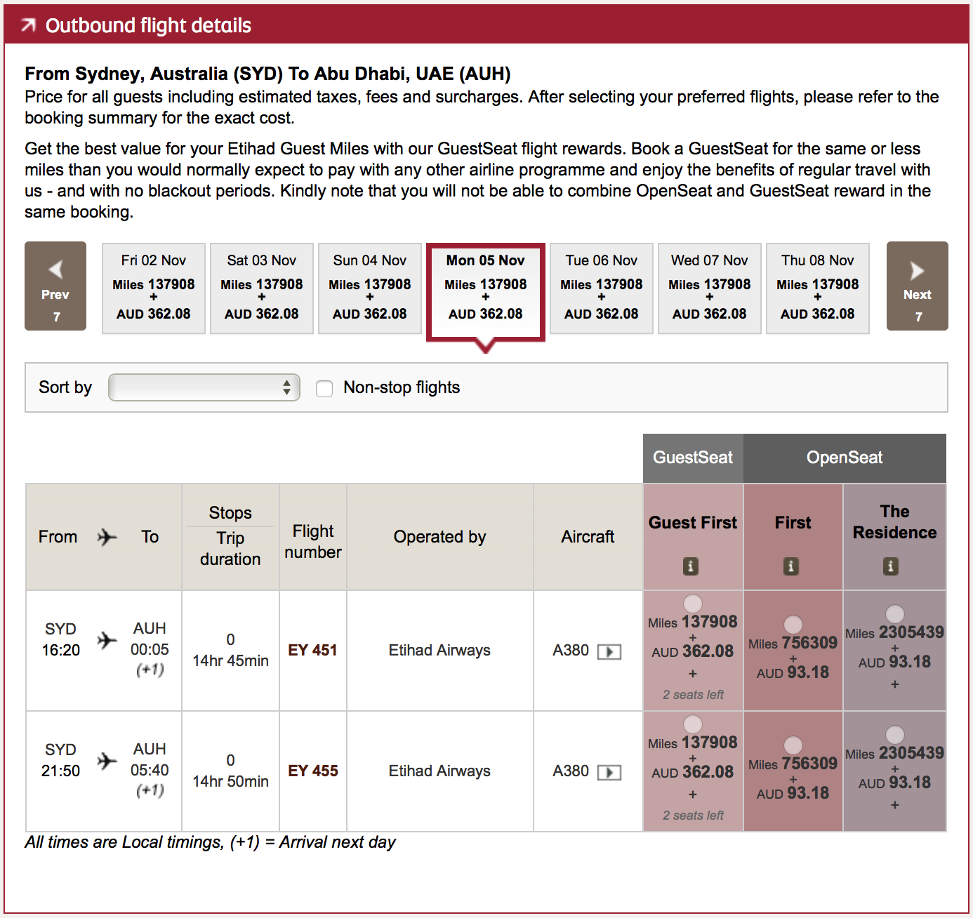 And it doesn't end there. There are also a ton of dates with at least two awards seats available on flights between Sydney (SYD) and Abu Dhabi (AUH). Any days that show Guest First seats available at 137,908 Etihad miles are at the lowest award level. Again, you'd come out ahead by booking this award through American AAdvantage for 100,000 miles each way.