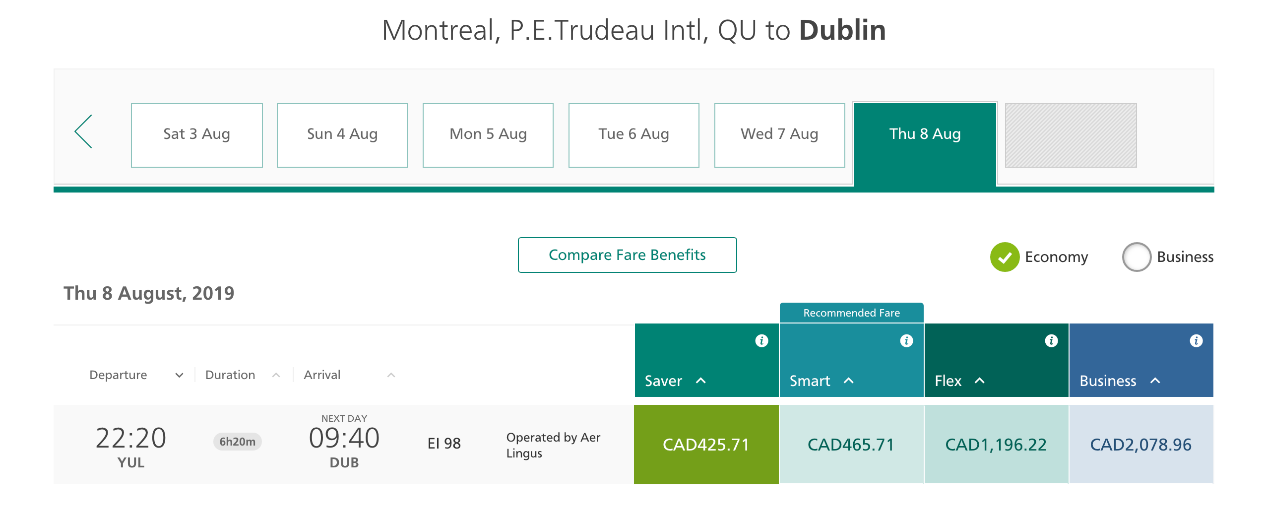 While the Montreal route launches on August 8, the carrier's schedule is only loaded until that date, meaning only one-way tickets are bookable at this time. One-way fares for the inaugural YUL-DUB flight are CAD 426 ($326).