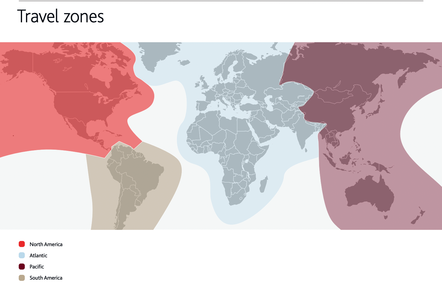 Aeroplan breaks up the world into four regions — North America, Atlantic, Pacific and South America. To know exactly how many points your award ticket will cost, it's important to know what zone you're flying to and from.