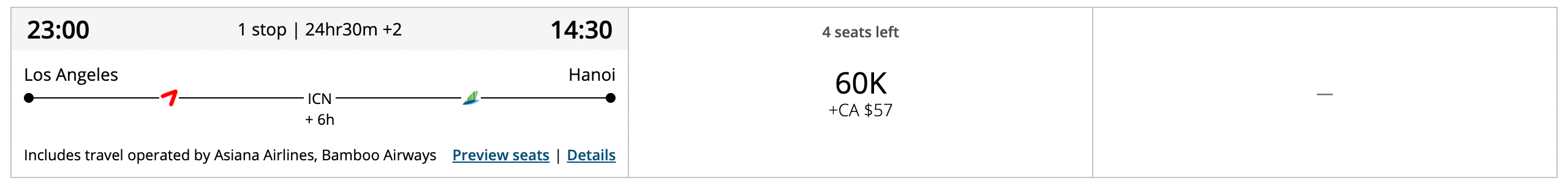 For example, you can get to major hubs like Seoul's Incheon International Airport (ICN) with Asiana and then connect to Bamboo Airways flights to cities like Hanoi and Ho Chi Minh City.