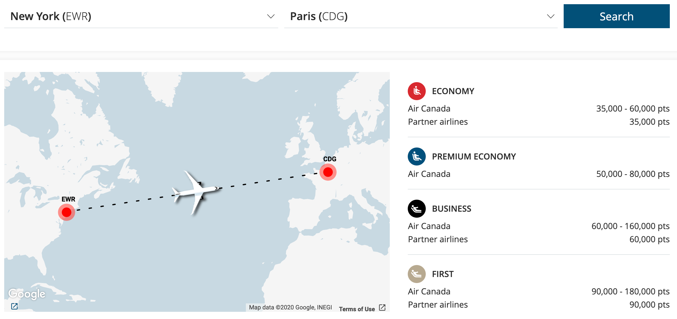 Given that every seat is available for award booking, you'll need to use more points for some cabins on certain flights. Using a flight between Canada and the U.S., for example, most economy awards will be priced between 12,500 and 17,500 points each way; between 20,000 and 35,000 for premium economy; and 25,000 to 60,000 for business class.