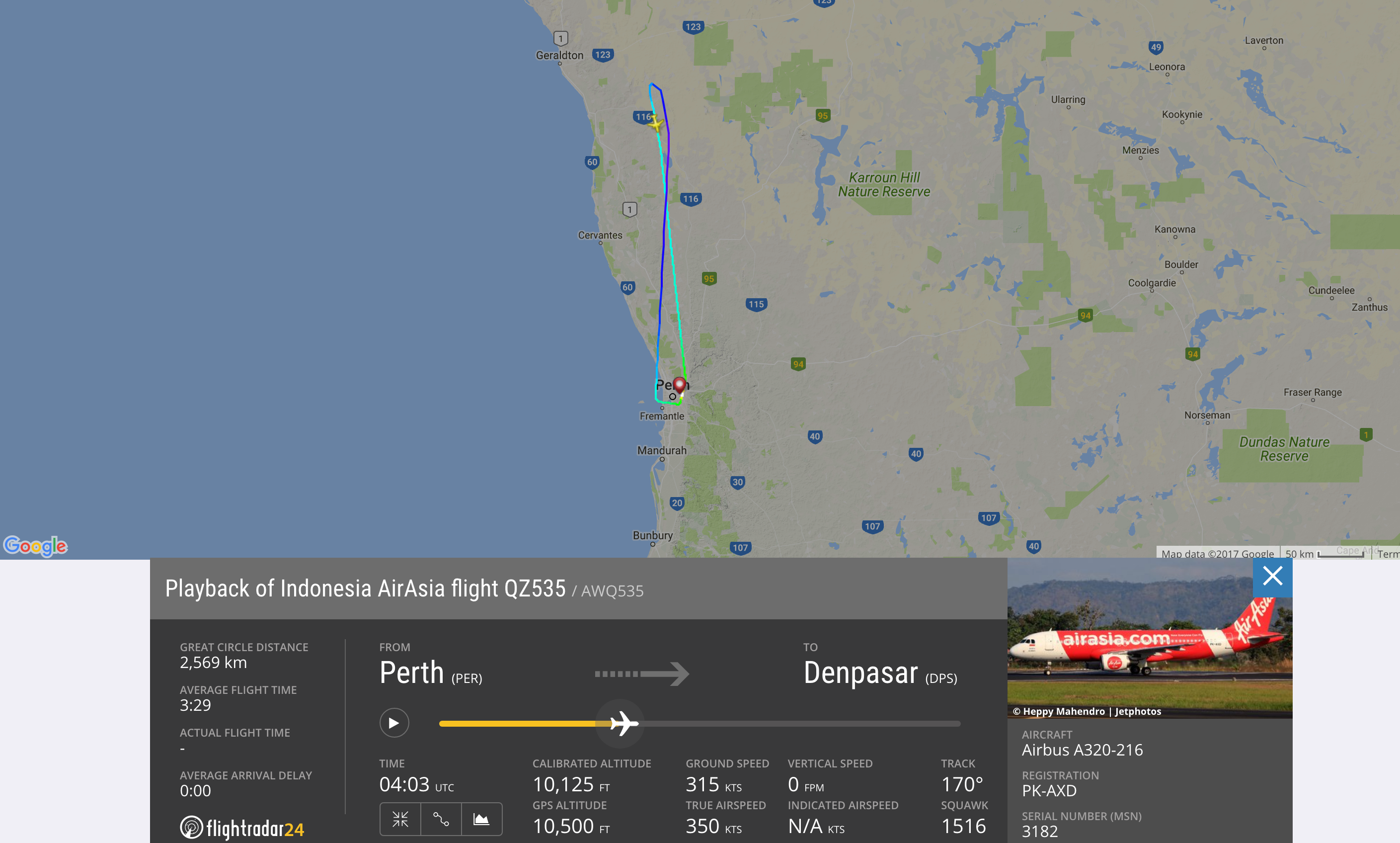 The A320 (registration PK-AXD, built in 2005 according to Airfleets.net) reportedly faced depressurization just after it had reached cruising altitude. It then quickly plummeted in altitude before landing safely back at PER. Data on FlightRadar24 shows that the aircraft plummeted from 33,925 feet to 10,125 feet in 11 minutes. One passenger said that because of the aircraft's rapid descent, passengers feared for the worst and were saying goodbye to each other.