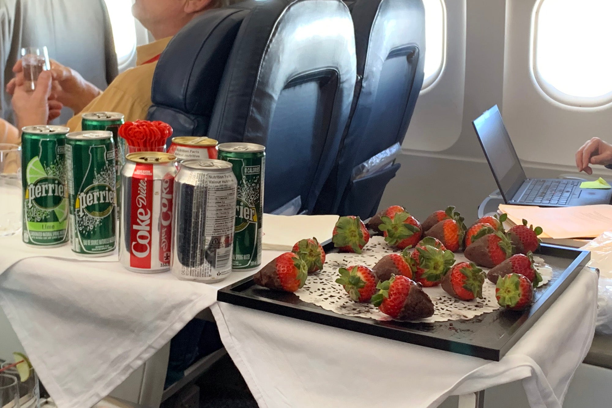 Finally, before landing at our first stop, the crew came through with chocolate-covered strawberries. Yum!