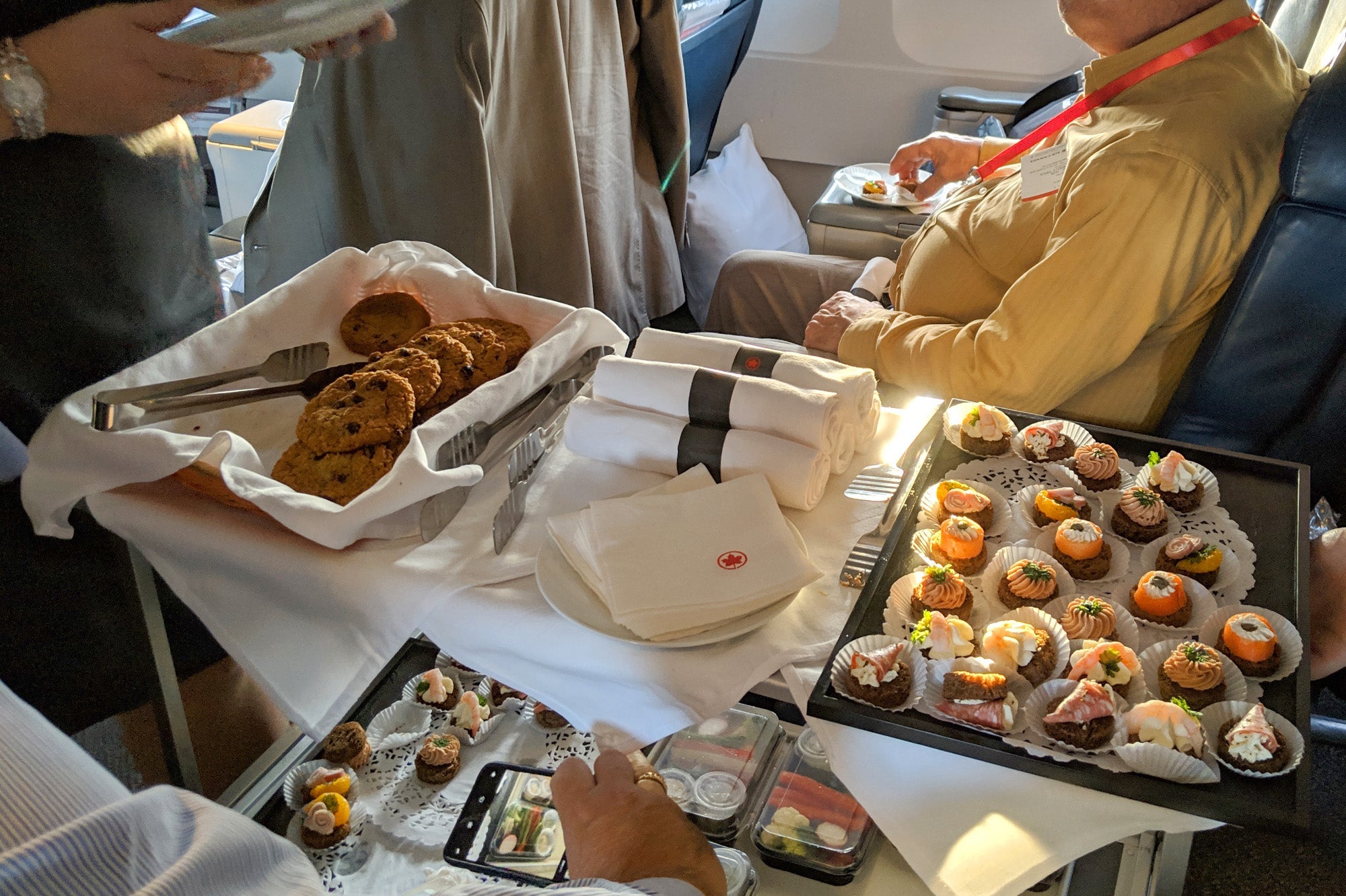 On that leg, options included warm cookies, crudites and assorted finger sandwiches. I wasn't at all hungry, but being in the last row, I grabbed a couple things anyway, given that the next stop was the garbage can.