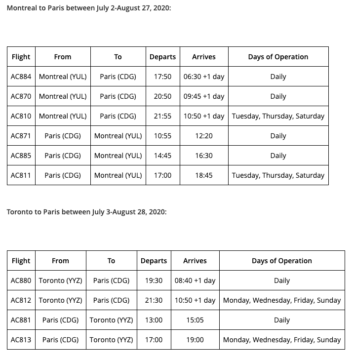 The extra summertime flights are in addition to the two daily round-trip flights Air Canada already offered to Paris Charles de Gaulle (CDG) from Montreal (YUL) and one daily round-trip from Toronto Pearson (YYZ).