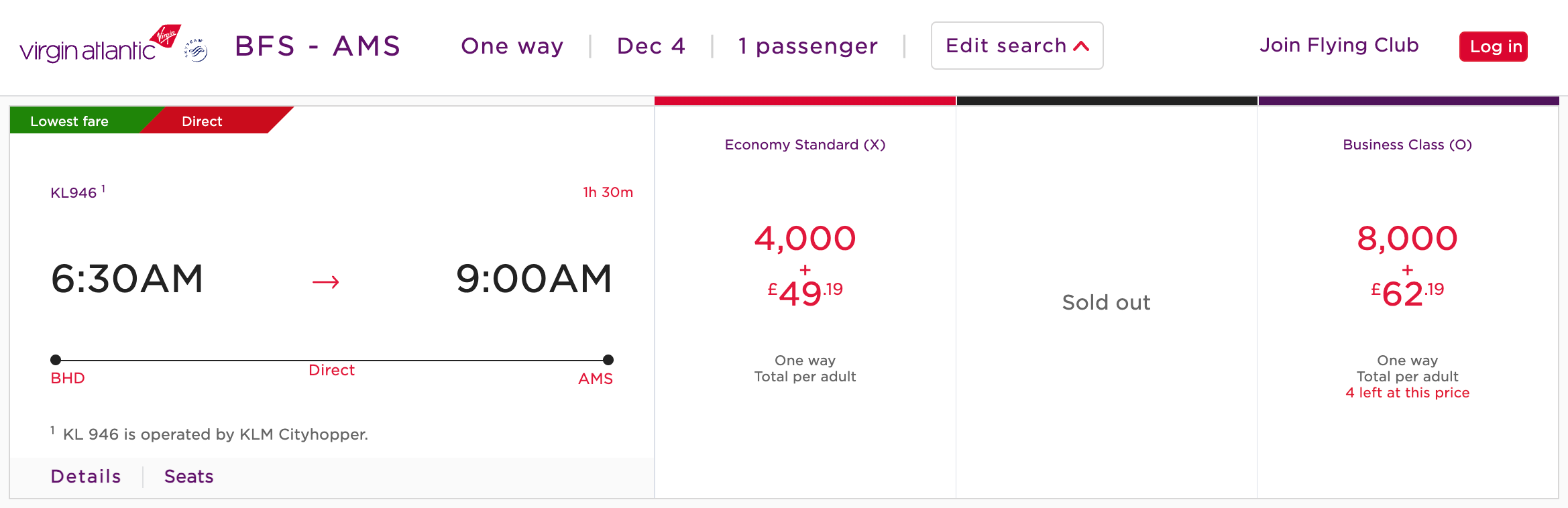 A KLM flight from Belfast International Airport (BFS) to KLM's hub at Amsterdam Airport Schiphol (AMS) costs 5,625 miles and $63 if booking through Air France-KLM's own Flying Blue program — but you could book the same flight for only 4,000 points and 49 British pounds ($63) through Virgin Atlantic Flying Club.