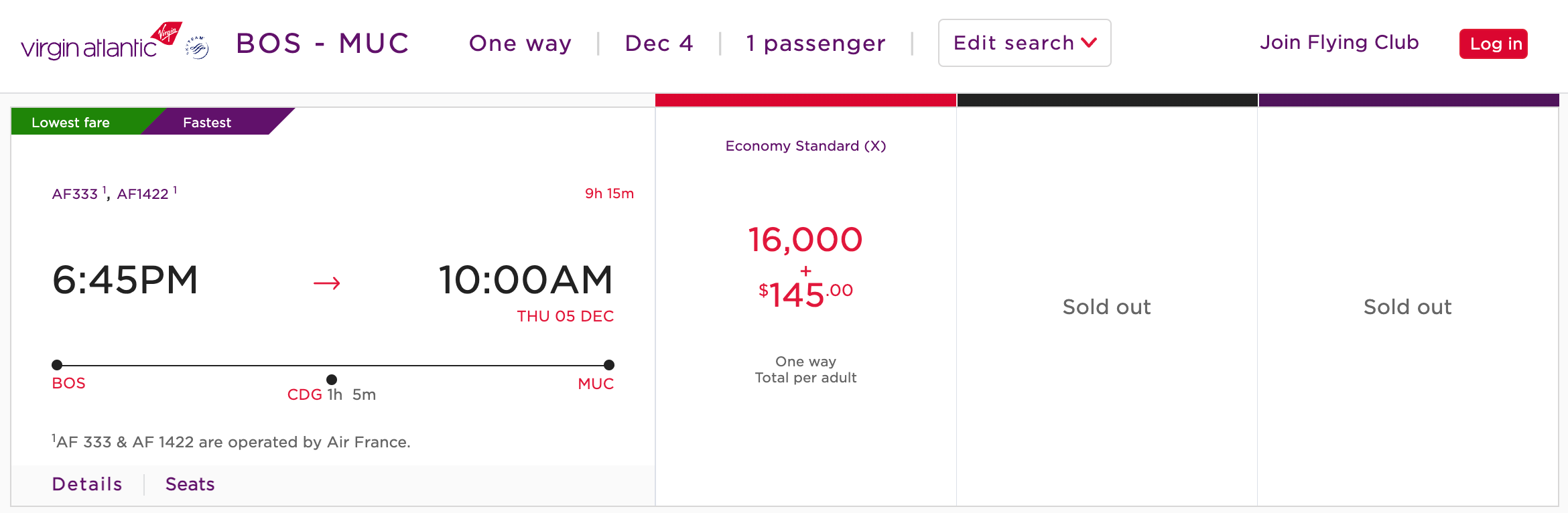 We now see plenty of Air France- and KLM-operated flights bookable with Virgin points on the Flying Club website. For instance, you could fly from Boston Logan International Airport (BOS) to Munich Airport (MUC) in December to see the Christmas markets for 16,000 Virgin points and $145.