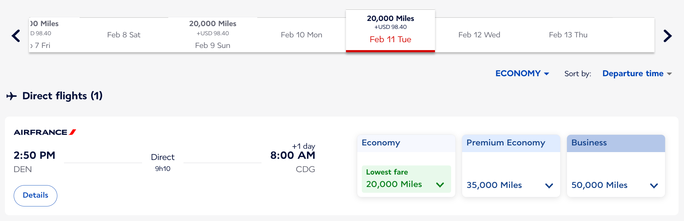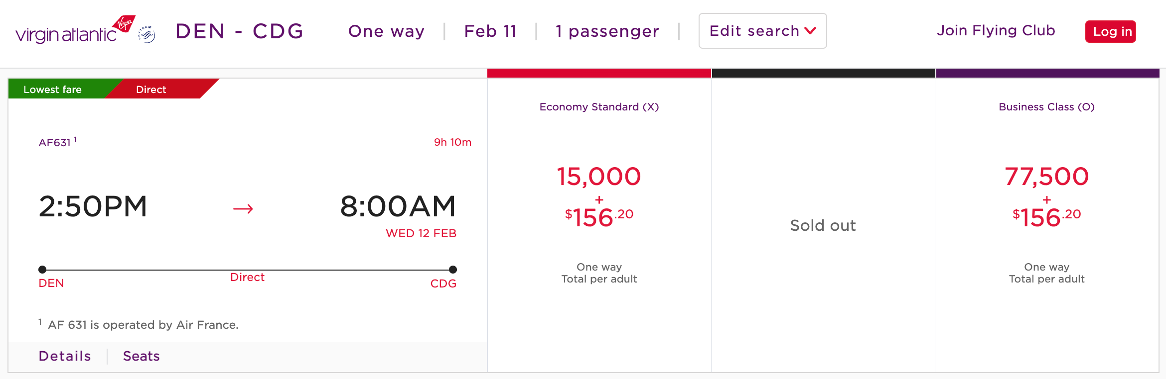 For a February flight from Denver International Airport (DEN) to Paris-Charles de Gaulle Airport (CDG), the economy ticket costs fewer points through Virgin's Flying Club, but the business-class ticket is cheaper when booked via Air France-KLM's Flying Blue program.