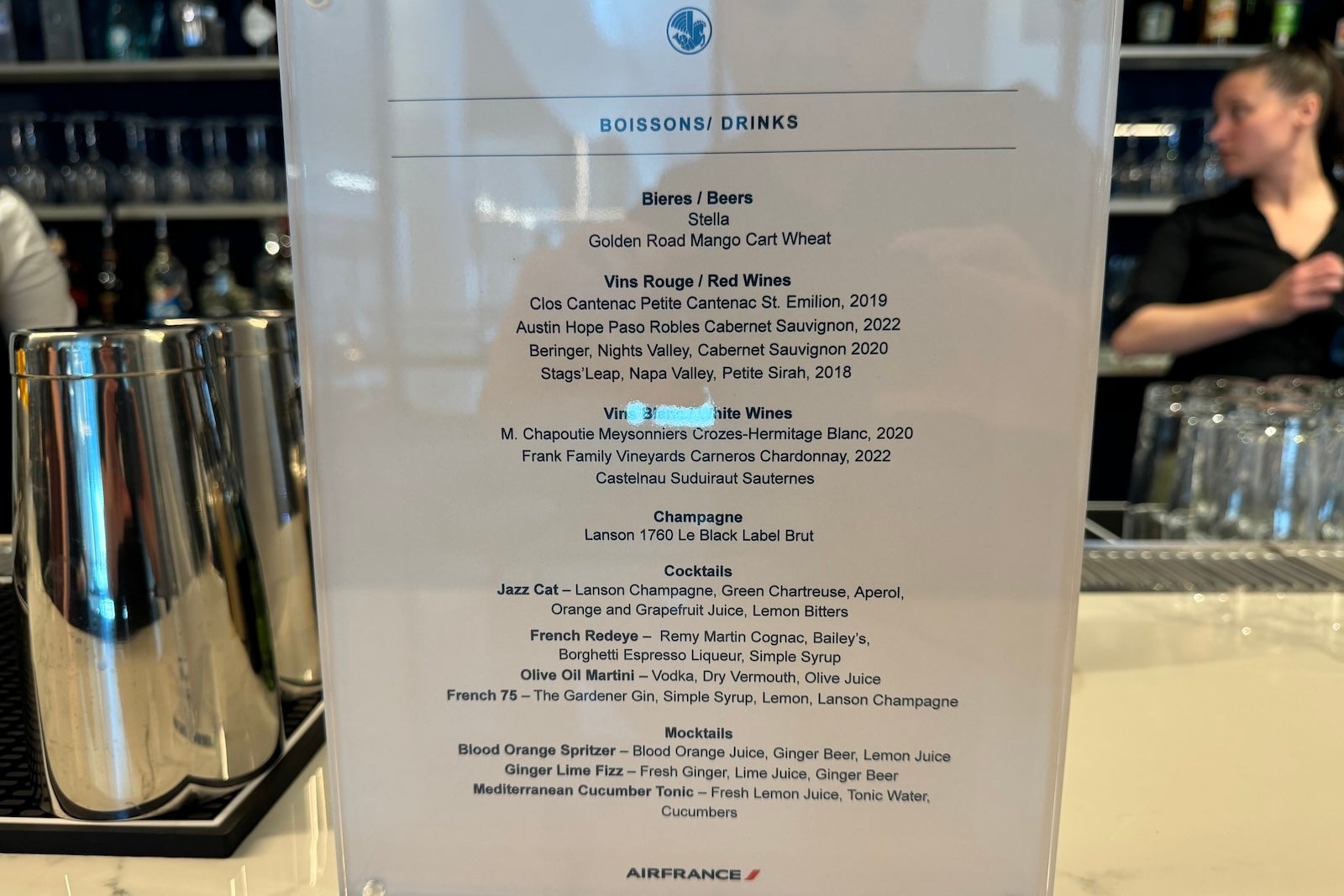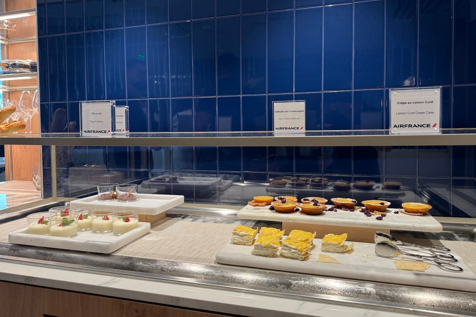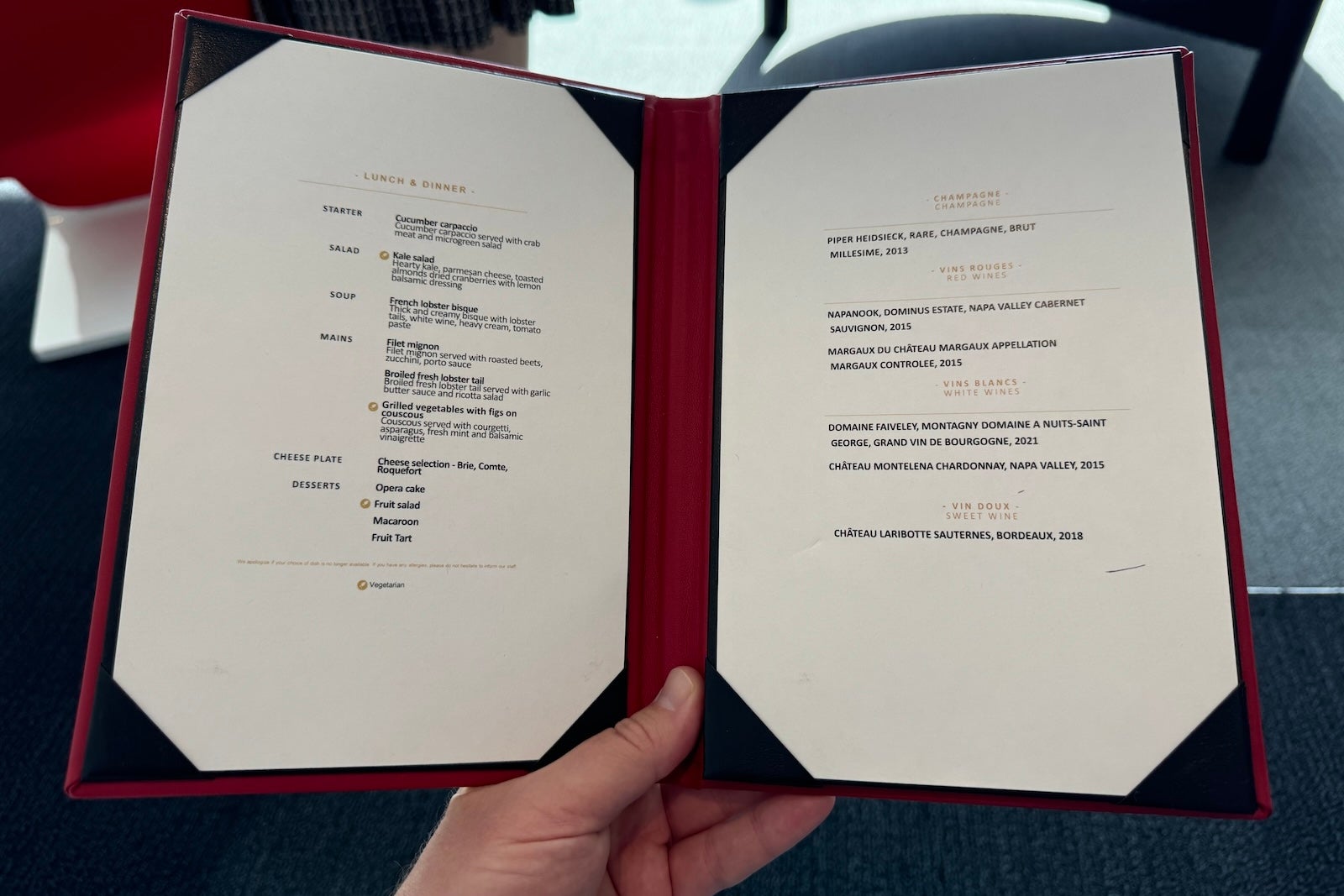 La Premiere lounge visitors can order from an a la carte menu that includes items like French lobster bisque, filet mignon with roasted beets and zucchini in a port sauce, grilled vegetables with figs on couscous, and a selection of cheeses and desserts, as well as a special wine selection with choices such as 2013 Piper-Heidsieck Rare Brut Champagne, Margaux du Chateau Margaux 2015 from Bordeaux and 2021 Domaine Faiveley Montagny Domaine, among others.