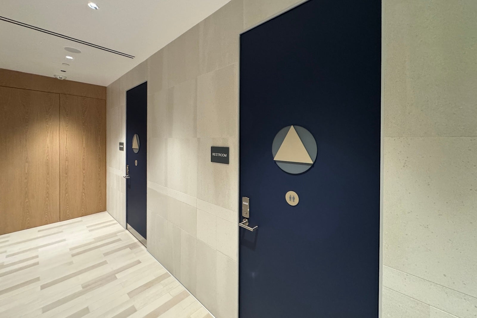 The restroom section has private unisex stalls, some of which are wheelchair accessible.