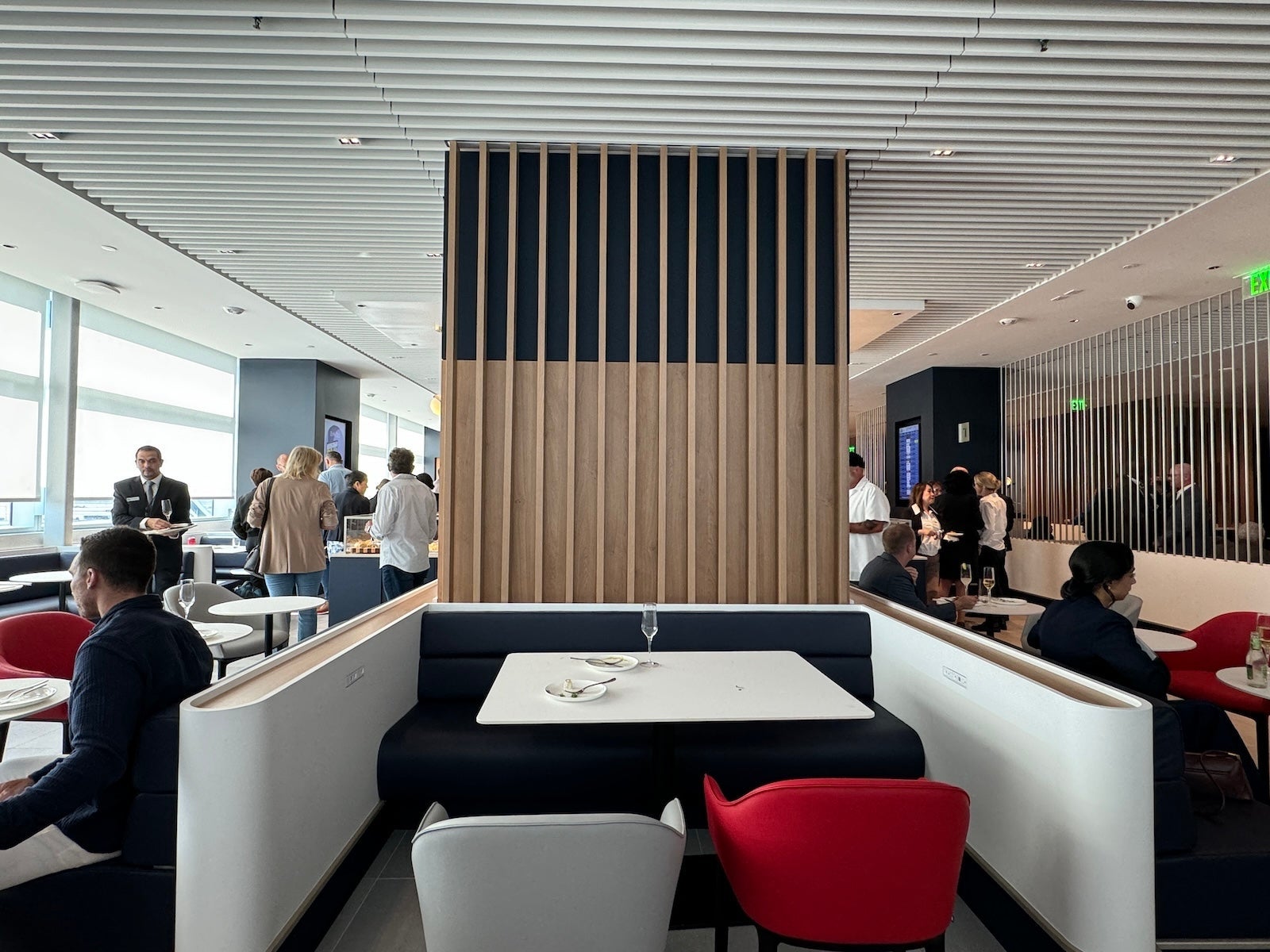 There is a brasserie-style dining area with booths lined up against the windows overlooking the tarmac and a large communal table for solo travelers and groups.