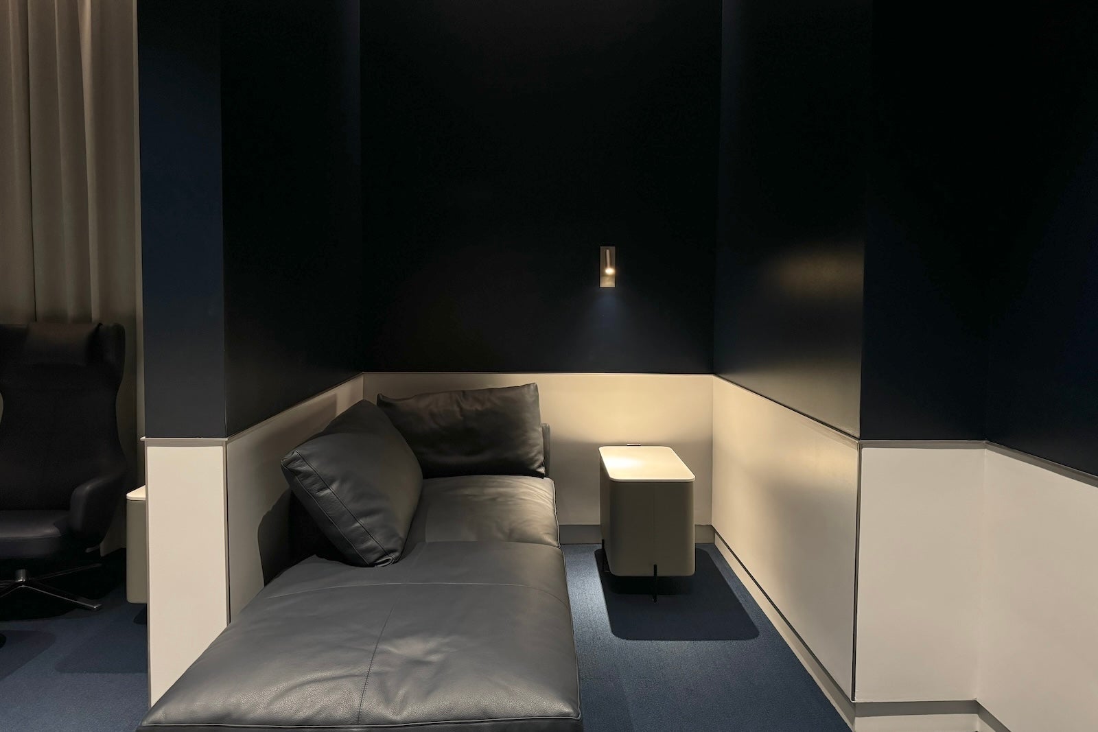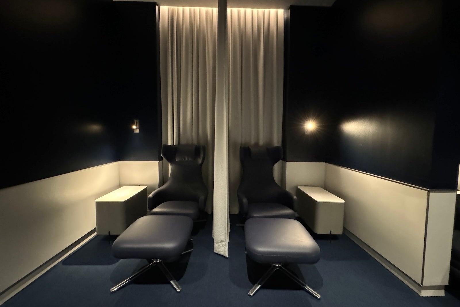 Guests can stretch out on sofas and chairs with ottomans for a little nap or meditation session ahead of their flights in the quiet room, which is tucked into its own separate corner of the lounge on the other side of reception, near the showers.