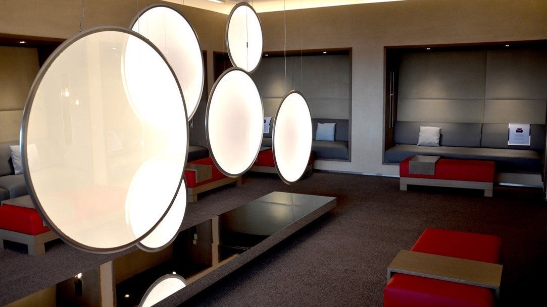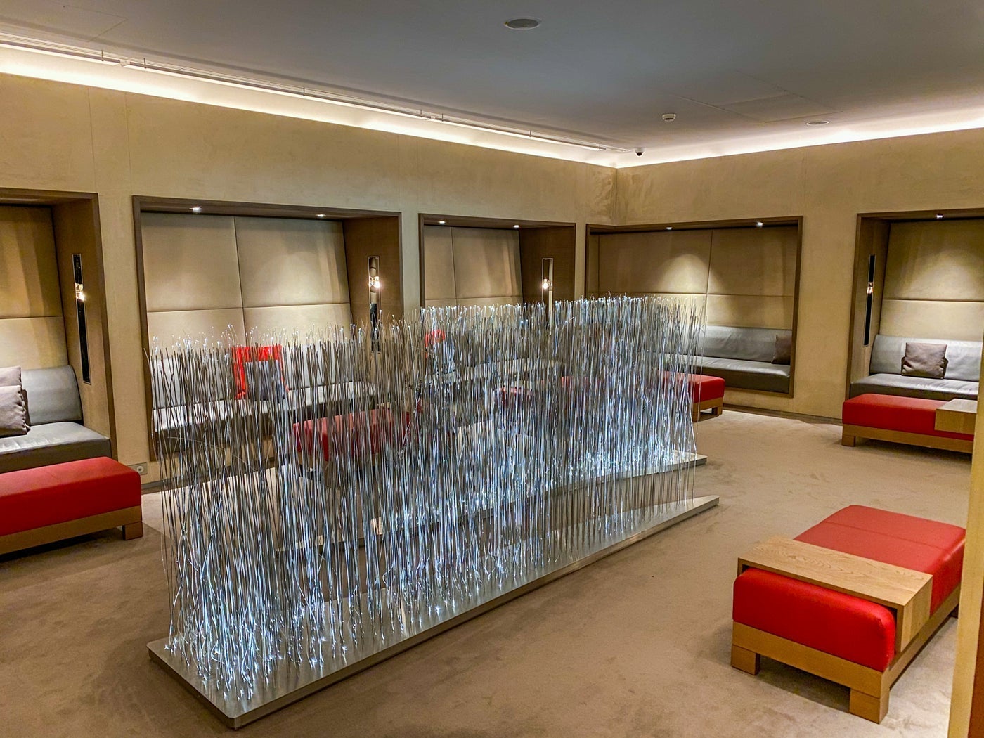 In order to create more privacy for passengers seated in the alcove in the back of the lounge, Air France has installed a new lighting fixture. The aerial light bubbles provide those seated in the area with more privacy from their other neighbors — you can swipe through to see the old arrangement.