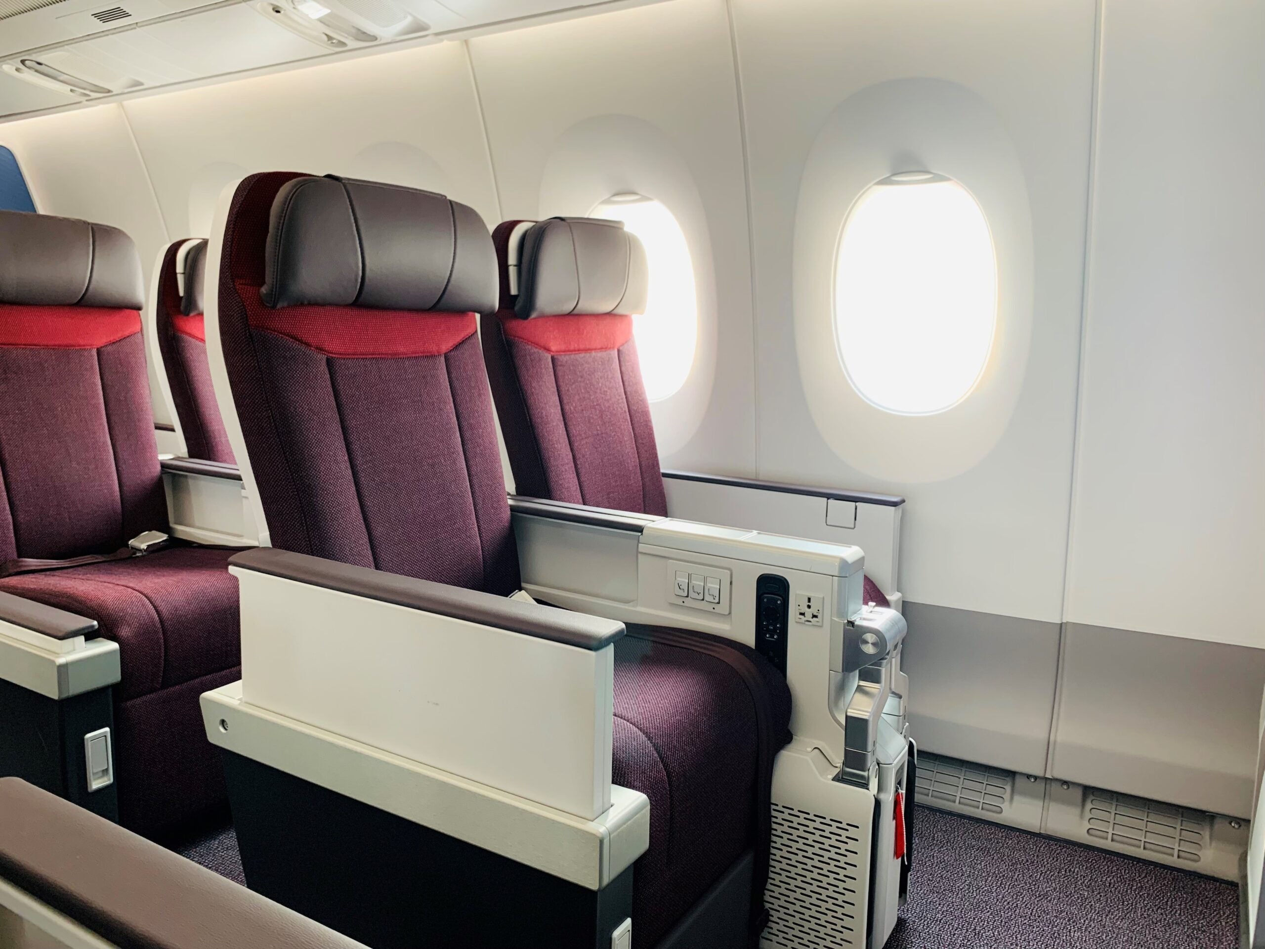 In many ways, these premium economy seats resemble domestic first-class recliners. They also offer winged headrests, a leg rest and large 13.3-inch high-definition touchscreen TVs.
