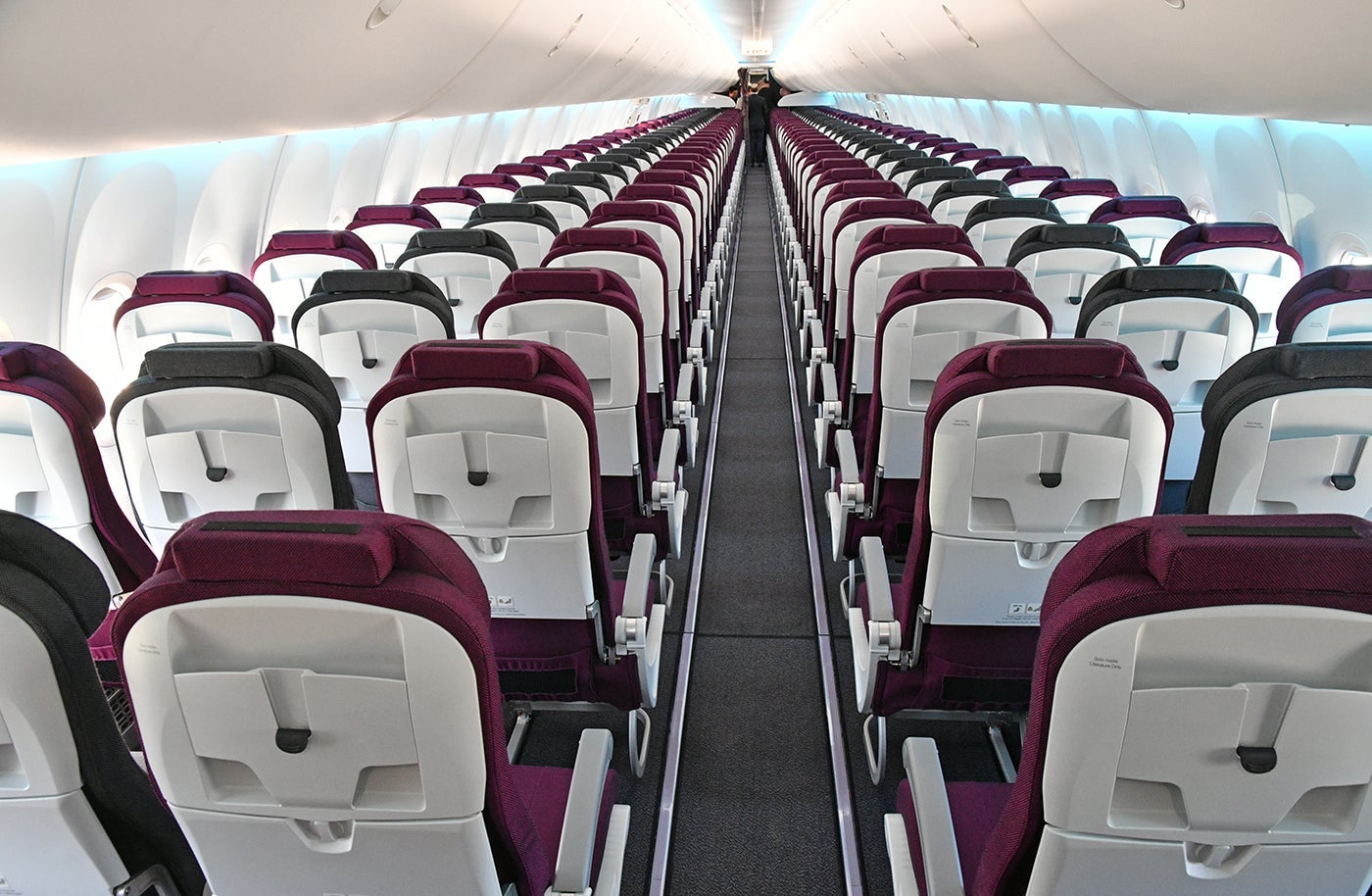 Its airplanes sport, outside and inside, a look very much reminiscent of Qatar's maroon-dominated branding. The cabin is in a one-class layout without fixed dividers between the business and coach sections; the premium end of the cabin, behind a curtain, will be differentiated by blocking the middle seat in the classic 3-3 arrangement as well by a bit more legroom even though seats are the same, with roughly 33 inches of pitch out front and 30 in back.