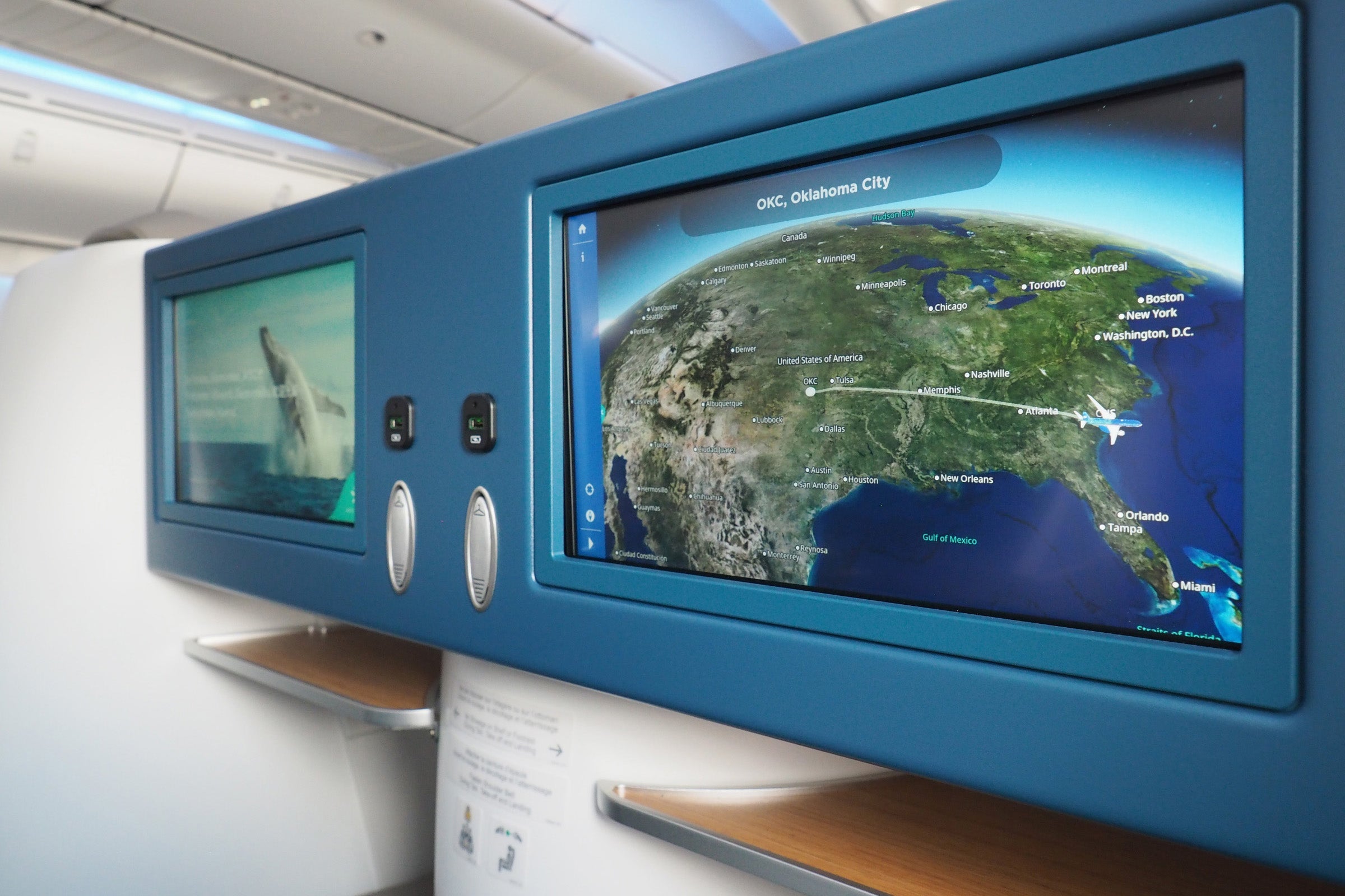 Bulkhead seats have far more legroom, plus a slide-out footrest, though you're also much farther away from the 13-inch touchscreen display.