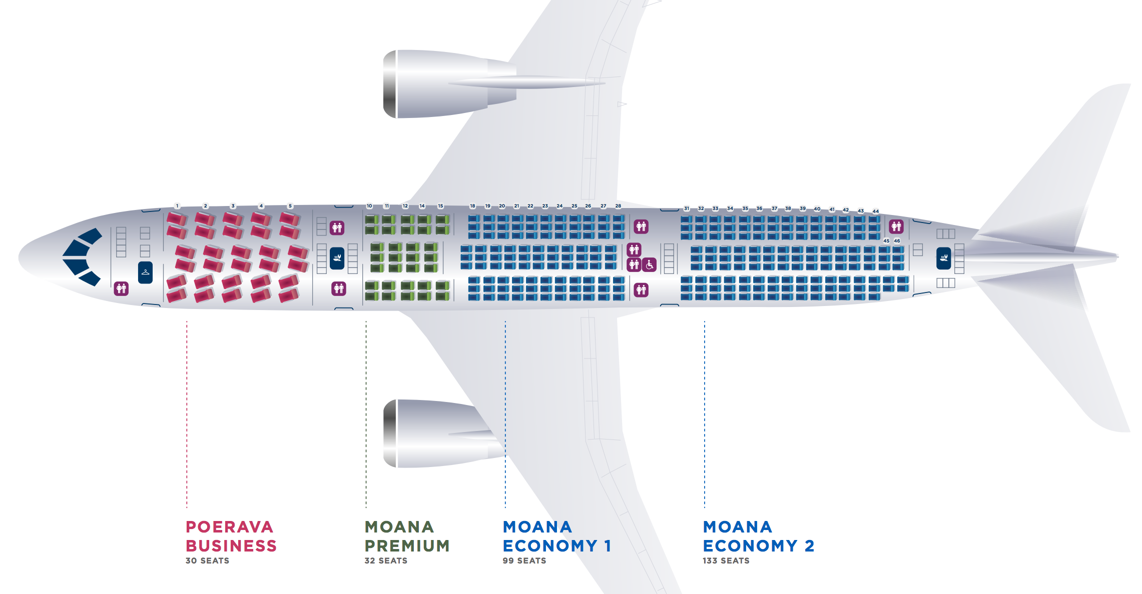 Air Tahiti Nui's 787-9 seats a total of 294 passengers — exactly the same number as the airline's aging A340-300s. The Dreamliner has more premium seats, though, with 30 lie-flat seats in business class and 32 in premium economy.
