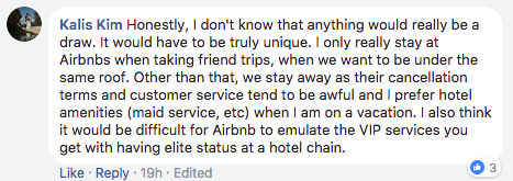 Kalis Kim expressed frustration at the the company's cancellation policy and suggested it would be hard to provide the same level of service to an Airbnb "elite" as a VIP would receive at a hotel.