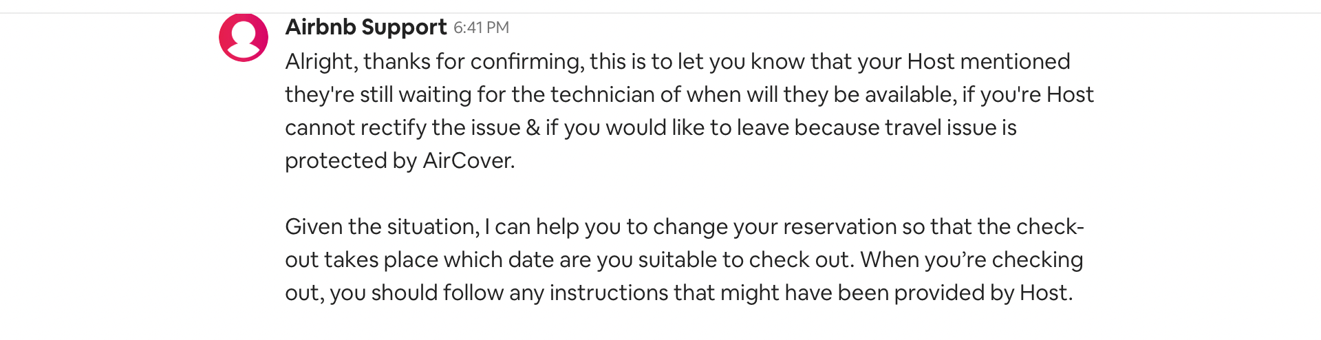 "Given the situation, I can help you to change your reservation so that the check-out takes place." The problem was that there was nowhere for us to move to from our current location. Airbnb Support sent a link to properties, many of which had their next availability in January (I was visiting the first week in August).