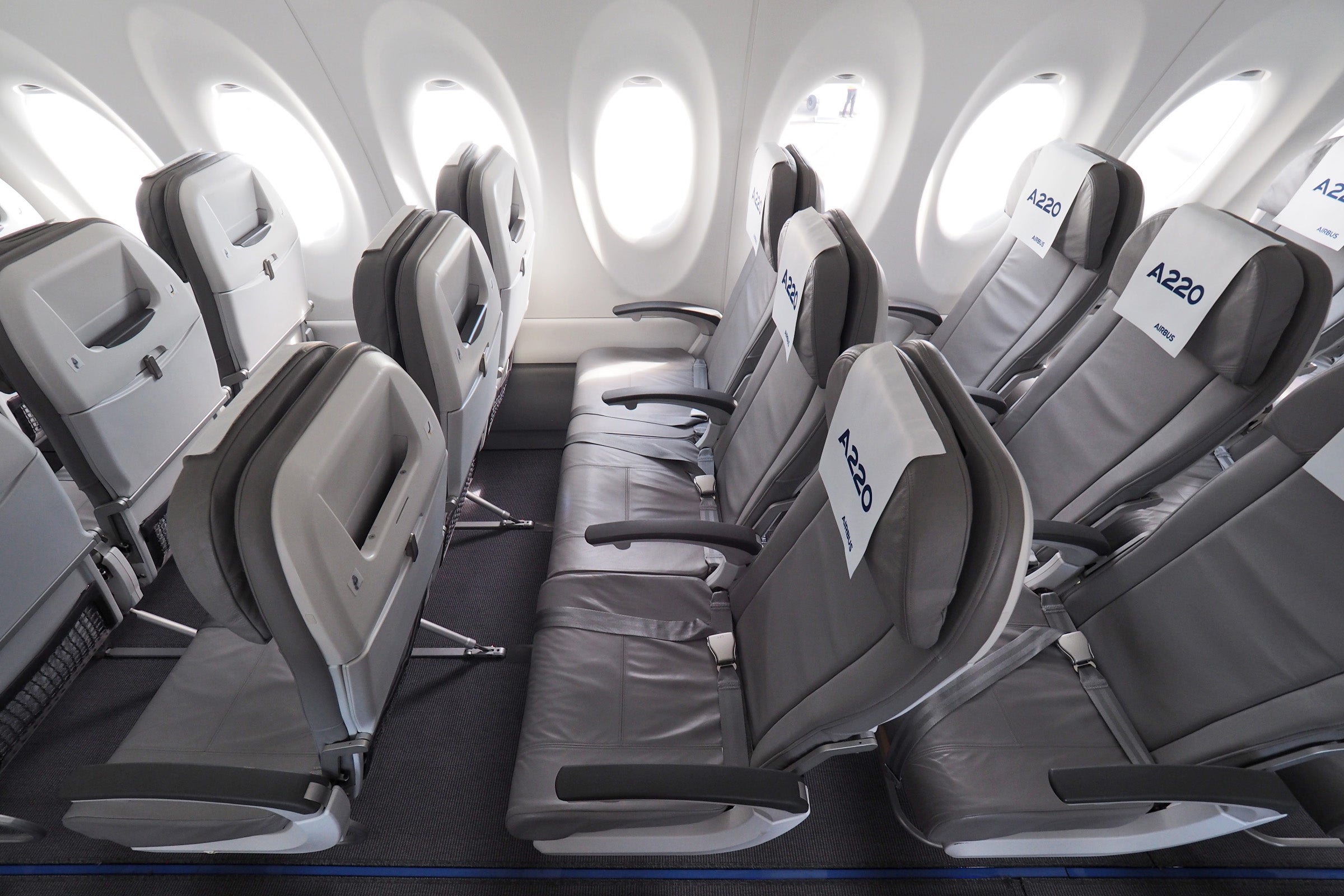 The larger -300 model made its airshow debut at Farnborough this week, with attendees getting a chance to peek inside. The interior is identical to that of the "old" CS300, which we've reviewed in the past, though Airbus has added its A220 branding to the headrest covers.