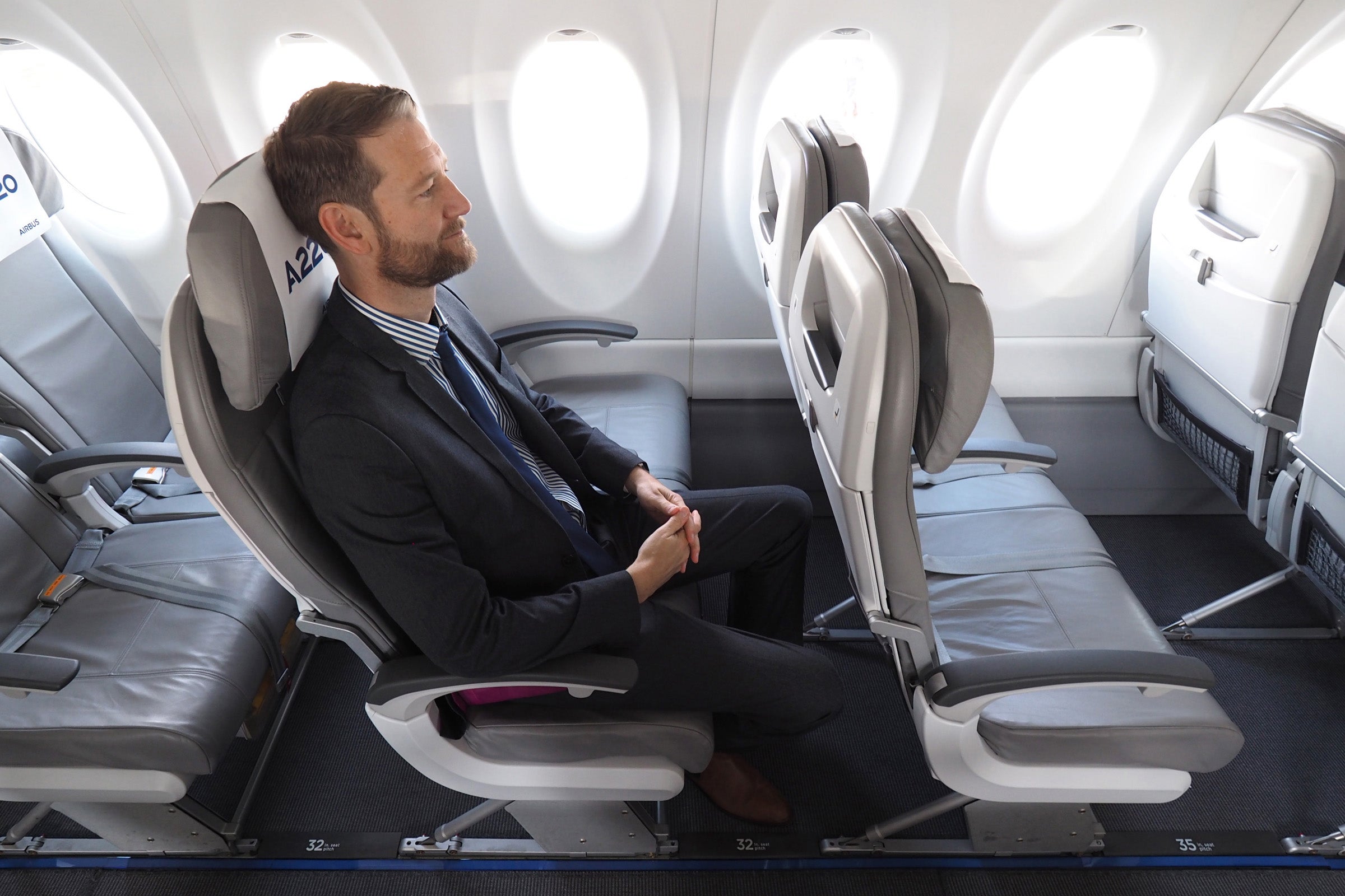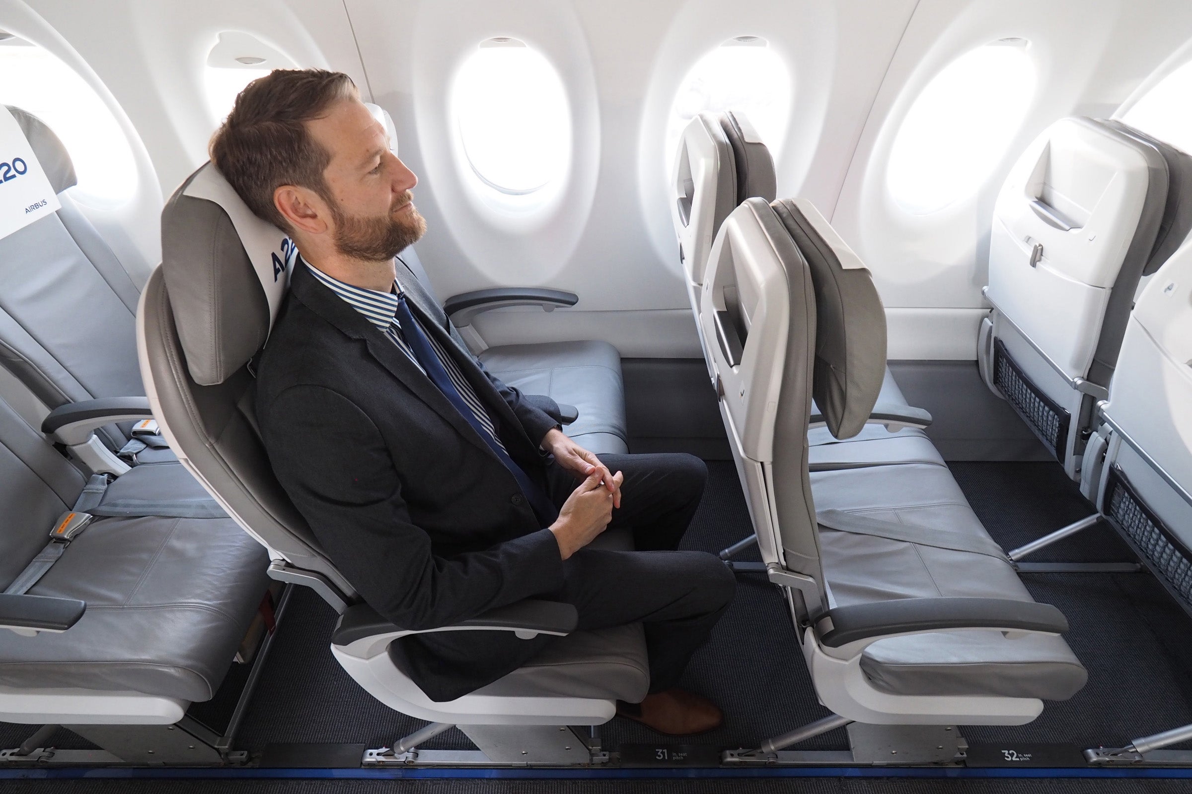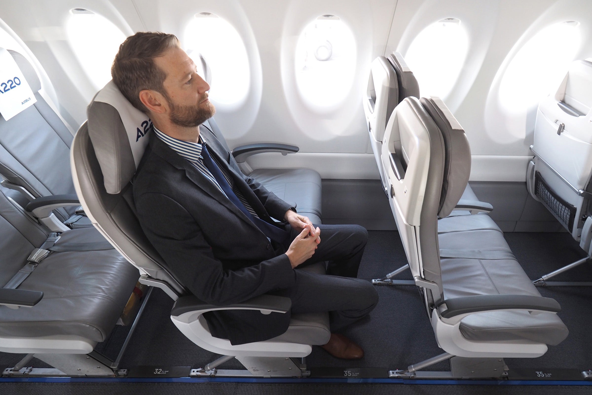 Considering the 3,600-mile range you'll get with the A220-300, six-hour transcon flights may become the norm — and if you're tall like Steve here, you'll hope your airline has opted to add more than 30 inches of pitch between seats.