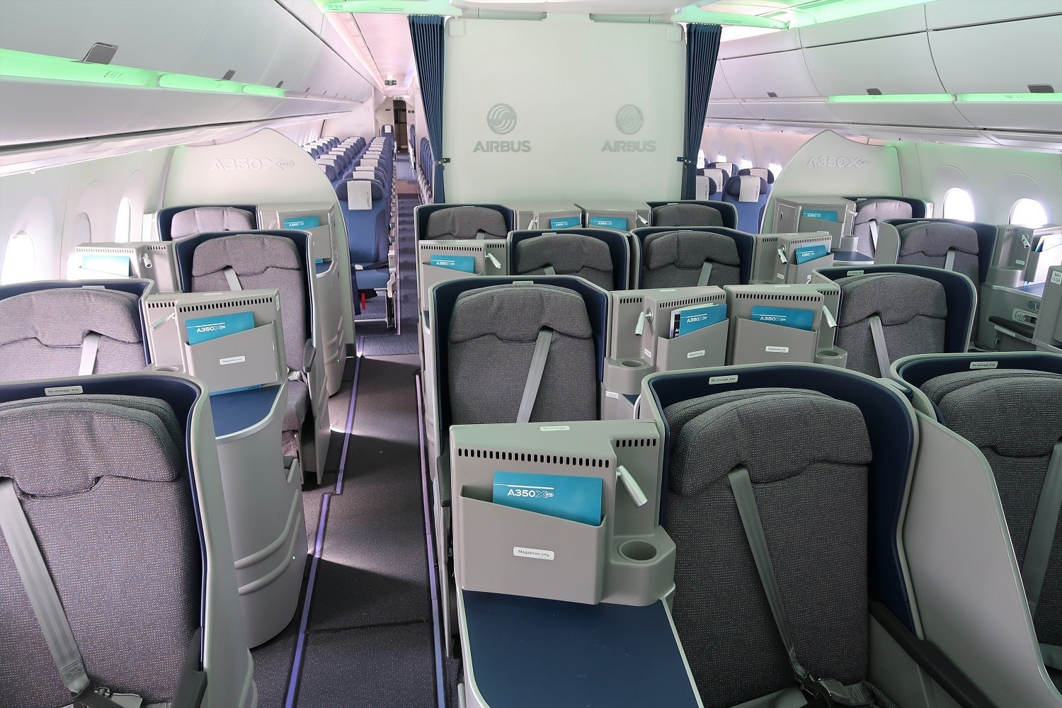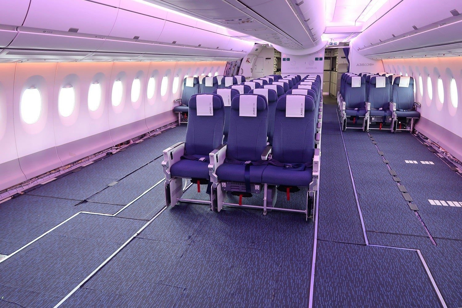In business class, Airbus has installed staggered 1-2-1 lie-flat seating.