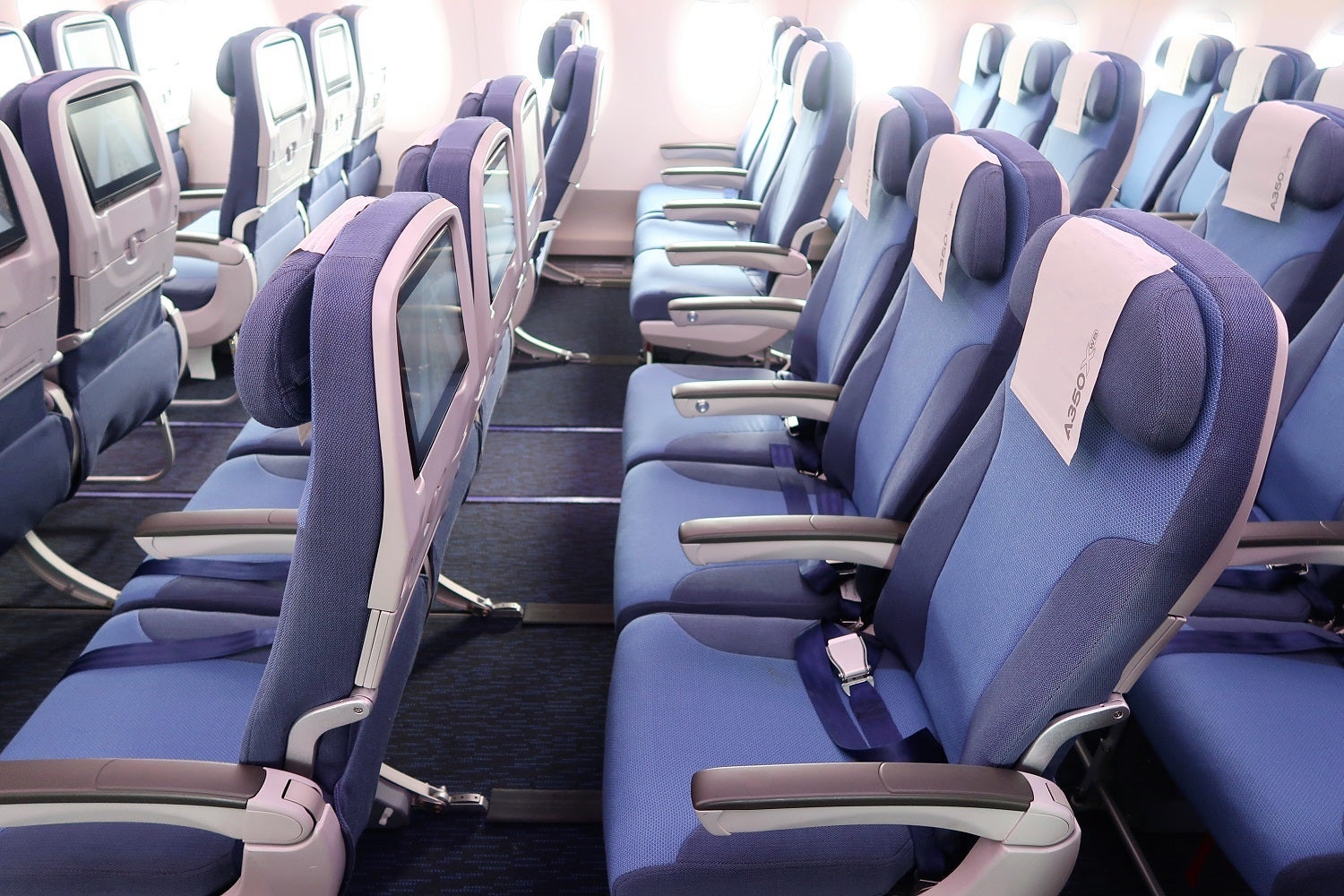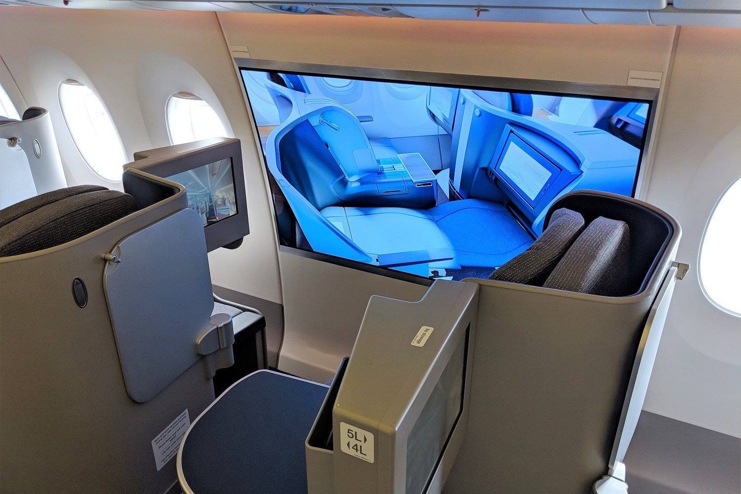 Besides the missing seats, this aircraft isn't special compared to what A350 flyers have already experienced. However, there's one experimental part of the aircraft: where there's a missing window in business class, Airbus is testing a new display screen.