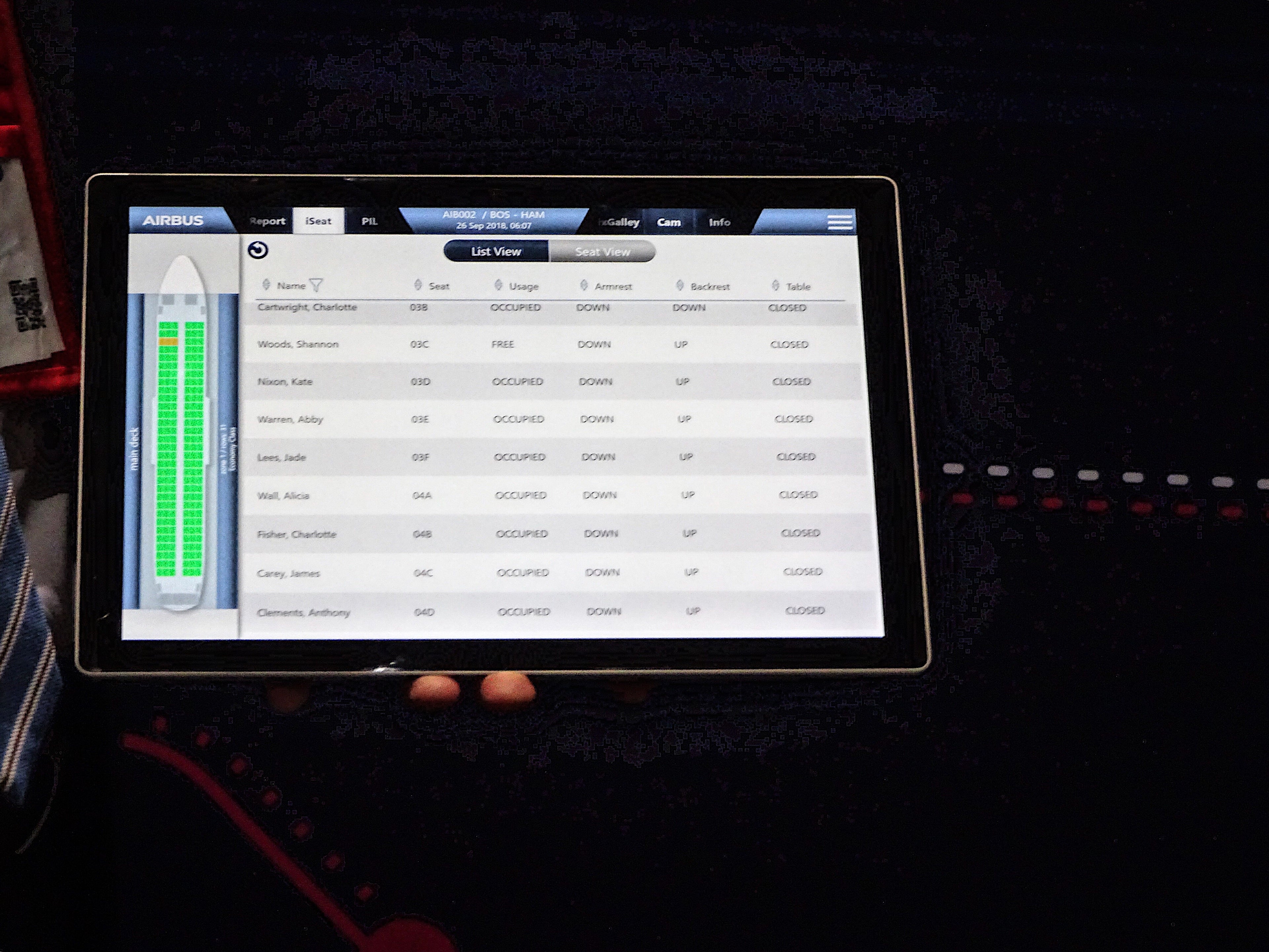The seats work to display some incredibly detailed information about how passengers spend time in their seats. The connected cabin tablet, using the iSeat program, displays who's in each seat, if it's occupied, whether the armrests are up or down, if the seatback table is in use and if passengers are reclined or not. When an attendee demoed the seat, it turned yellow almost immediately, indicating that it was occupied.