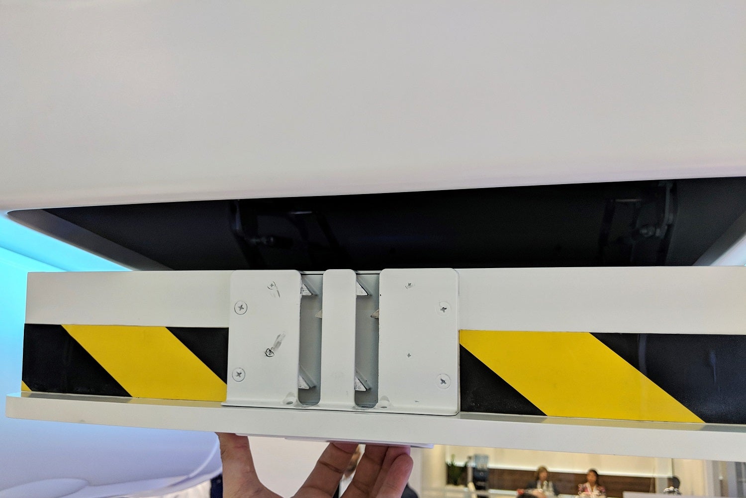 However, Airbus' ceiling stowage solution has a downside: It's only available as a retrofit to A319, A320 and A321s "classic cabin." The bin isn't "part of the Airspace concept." Airbus is also looking to bring the idea to wide-bodies. There's a super-secretive model of the A330 version that was walled off from public viewing at AIX. During my tour, I wasn't even able to look at it, much less take any photos of it.