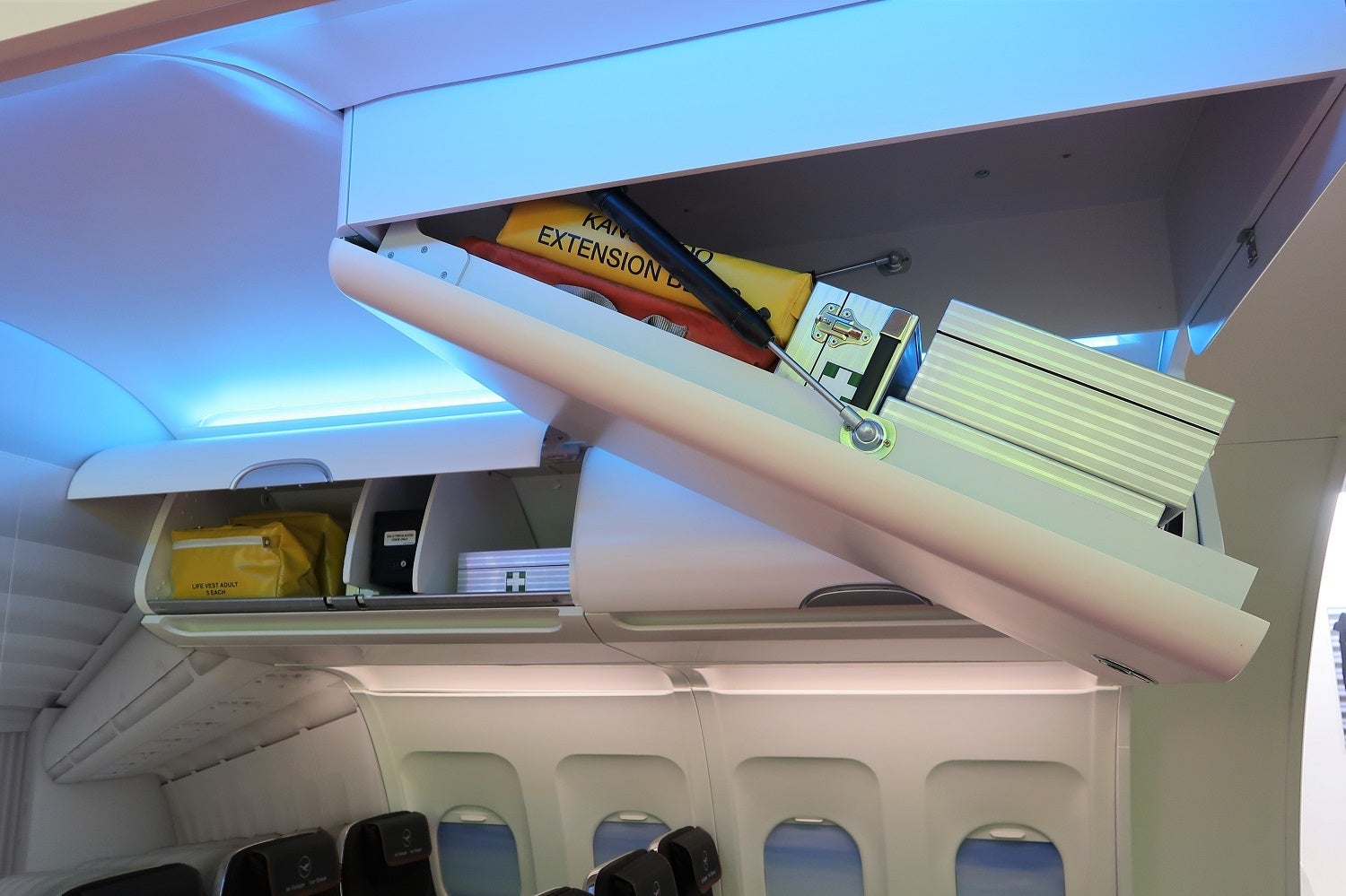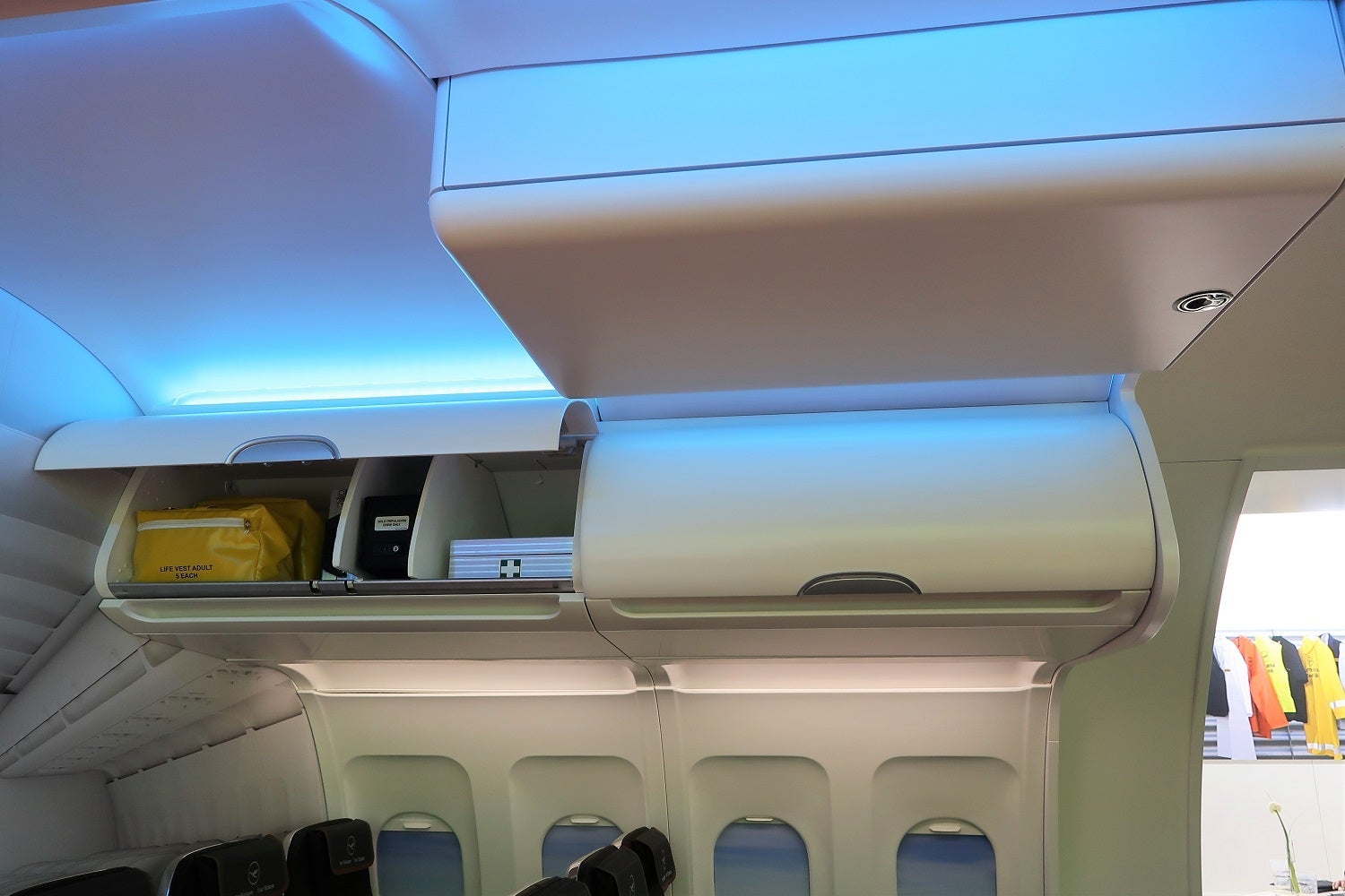 There are two notable features on the Airbus Ceiling Stowage solution that are not on the Lufthansa model: lighting and a double-locking mechanism. Airbus' product incorporates mood lightning into the sides of the bin. But the creative double-locking function is my favorite part of the Airbus solution. Designed to prevent unauthorized access to the bin, passengers can pull down on the handle as hard as they want to and won't be able to fully open the bin.