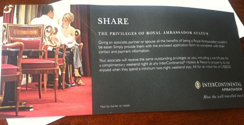 Intercontinental Royal Ambassador: TPG enjoyed this status himself back in 2011. Here are his notes on the process of being invited to Royal Ambassador status, and the perks (the most notable of which was the unlimited free minibar).
