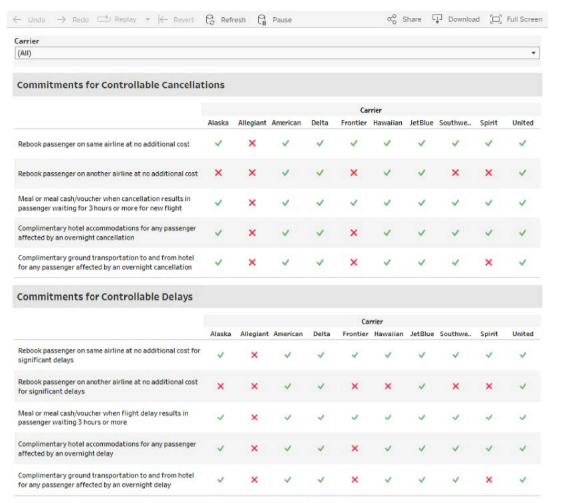 The new dashboard details airlines' commitments to rebooking passengers and providing meal cash or vouchers, overnight hotel accommodations and ground transportation to hotels.
